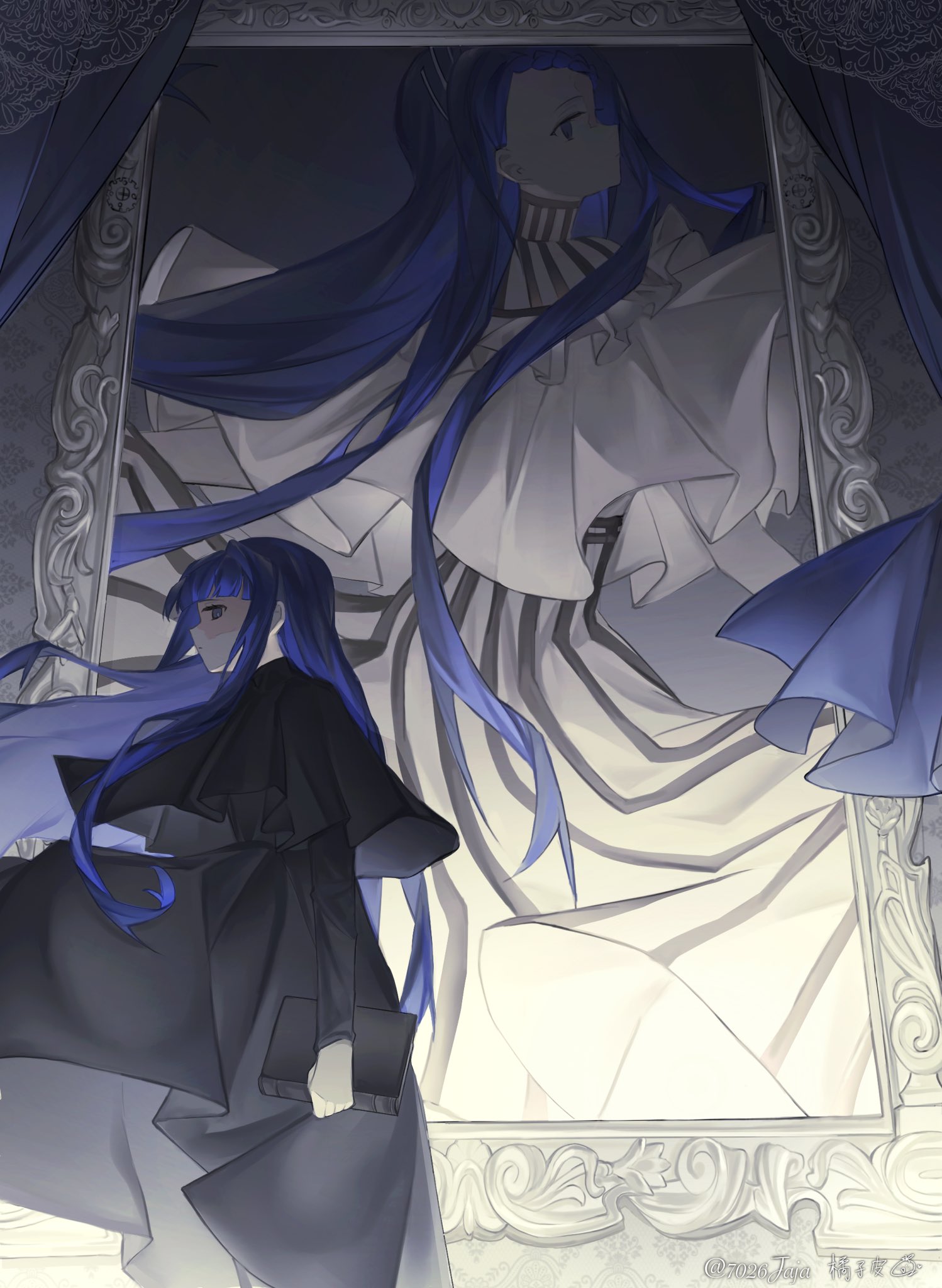 1girl 7026jaja ado_(utaite) black_dress blue_eyes blue_hair book chinese_commentary closed_mouth commentary_request dress floating_hair gira_gira highres holding holding_book long_hair painting_(object) sidelocks solo