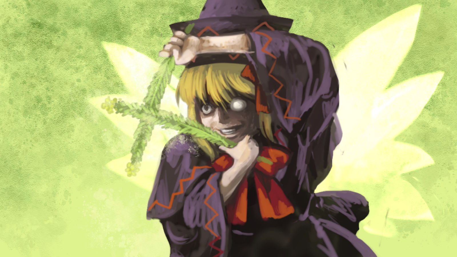 1girl alexander_anderson black_capelet black_dress black_hat blonde_hair bow bowtie capelet changing_seasons_(touhou) commentary_request dress fairy_wings flower glowing glowing_eye green_background grin hair_between_eyes hat hellsing highres holding holding_flower kawahagi_modoki lily_black lily_white long_hair looking_afar one-hour_drawing_challenge parody pose_imitation red_bow red_bowtie smile solo touhou upper_body wings yellow_flower