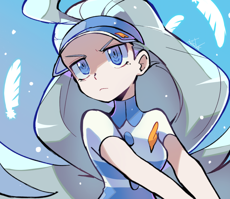 1girl ahoge blue_eyes blue_hair blue_hat breasts collared_shirt flipped_hair hat holding kahili_(pokemon) light_blue_hair long_hair medium_breasts mole mole_under_eye nintendo pokemon pokemon_sun_and_moon shirt short_sleeves solo striped_clothes striped_shirt upper_body visor_cap yuusuke-kun