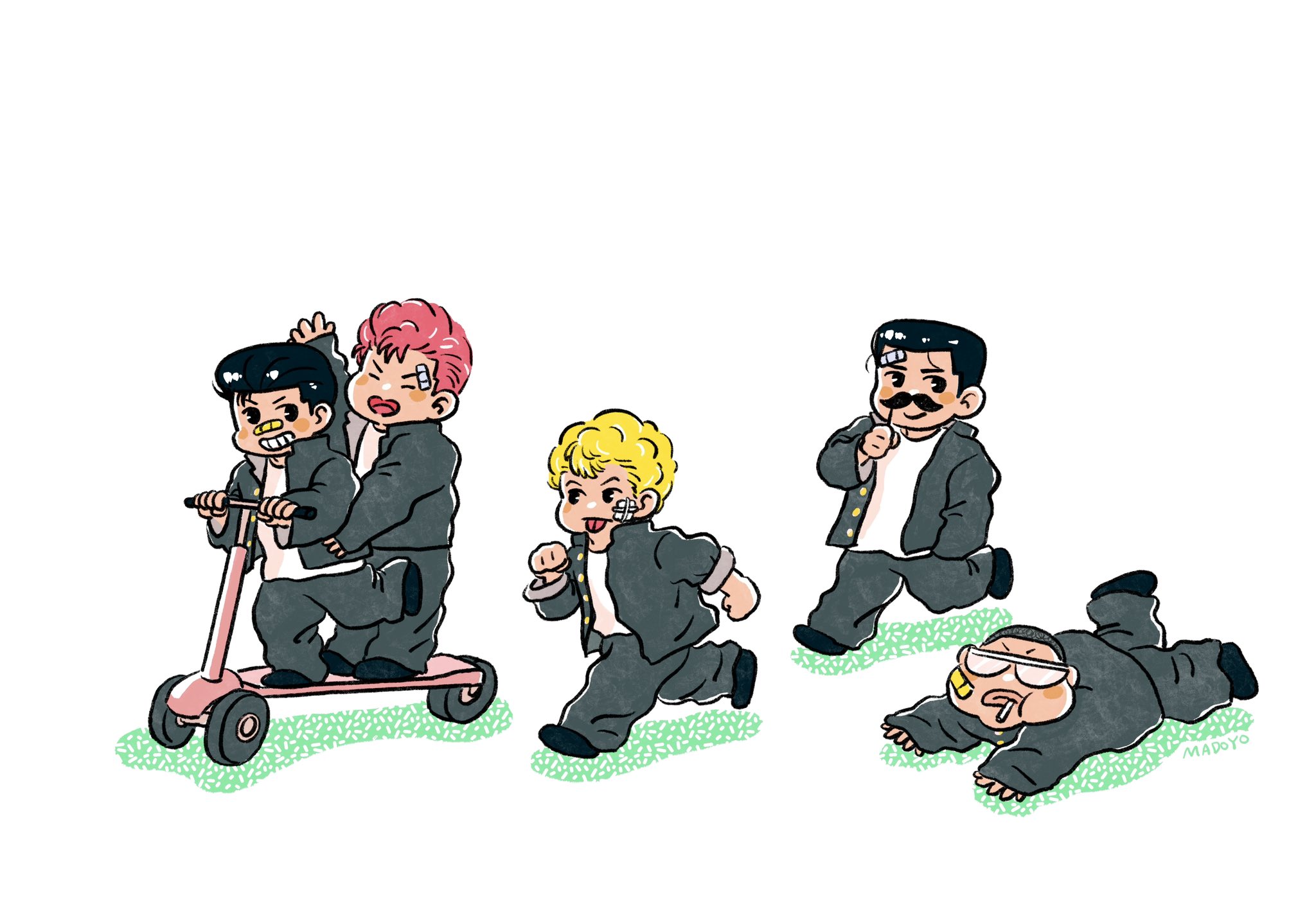 5boys arm_up bandaid bandaid_on_cheek bandaid_on_face bandaid_on_forehead bandaid_on_nose black_footwear black_hair black_jacket black_pants blonde_hair buzz_cut facial_hair full_body gakuran glasses hair_slicked_back highres jacket looking_at_another lying madoyo0000 male_focus mito_youhei multiple_boys mustache noma_chuuichirou on_scooter on_stomach ookusu_yuuji pants pompadour red_hair running sakuragi_hanamichi school_uniform short_hair simple_background slam_dunk_(series) smile takamiya_nozomi tongue tongue_out very_short_hair white_background