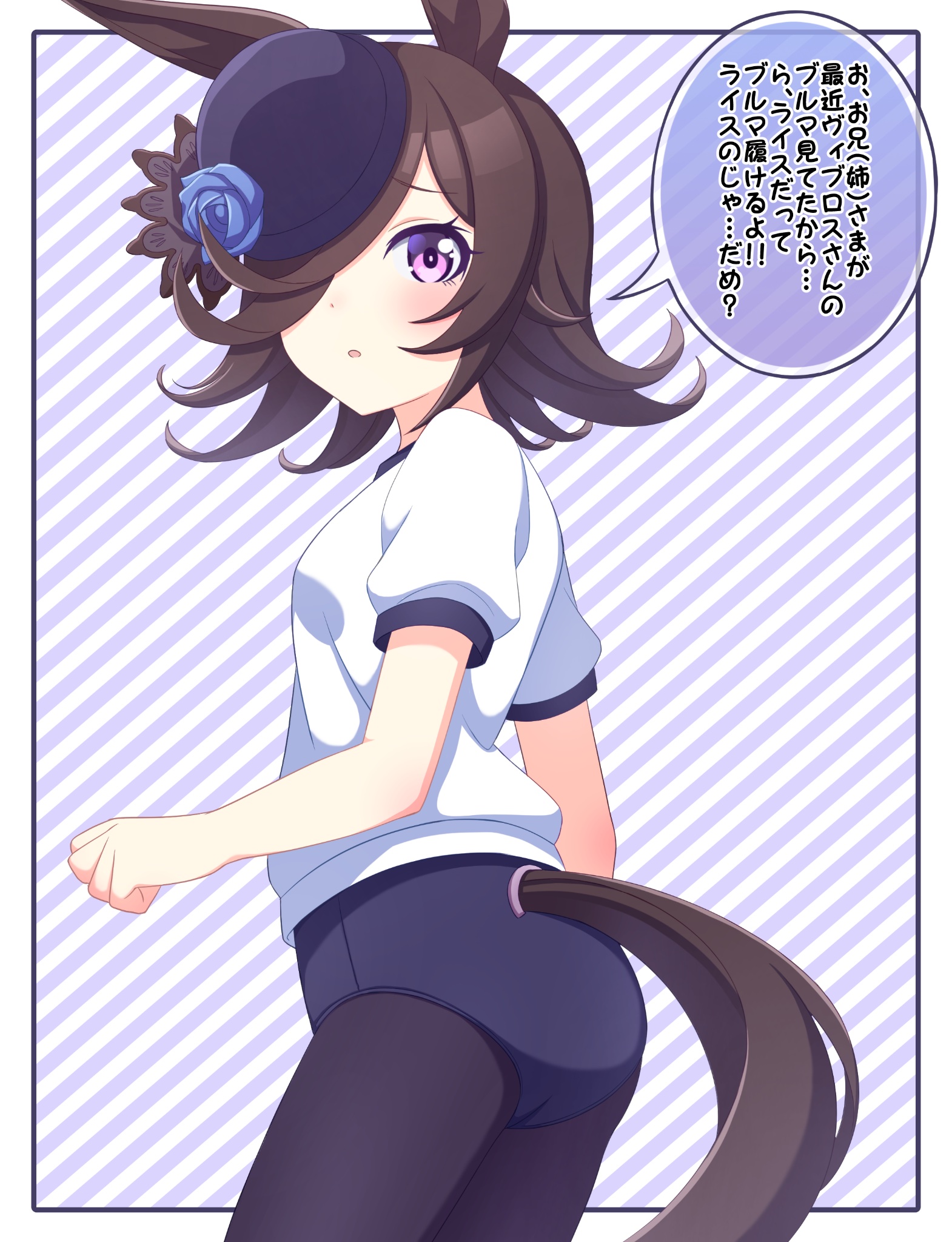 1girl alternate_costume alternate_hairstyle animal_ears ass black_pantyhose blue_buruma blue_flower blue_hat blue_rose blush border brown_hair buruma commentary_request cowboy_shot flower from_side gym_uniform hair_over_one_eye hat hat_flower highres horse_ears horse_girl horse_tail katsushika_yuki looking_at_viewer looking_to_the_side medium_hair outside_border pantyhose parted_lips purple_background purple_eyes rice_shower_(umamusume) rose shirt short_sleeves solo speech_bubble standing striped_background tail tilted_headwear translation_request umamusume white_background white_border white_shirt