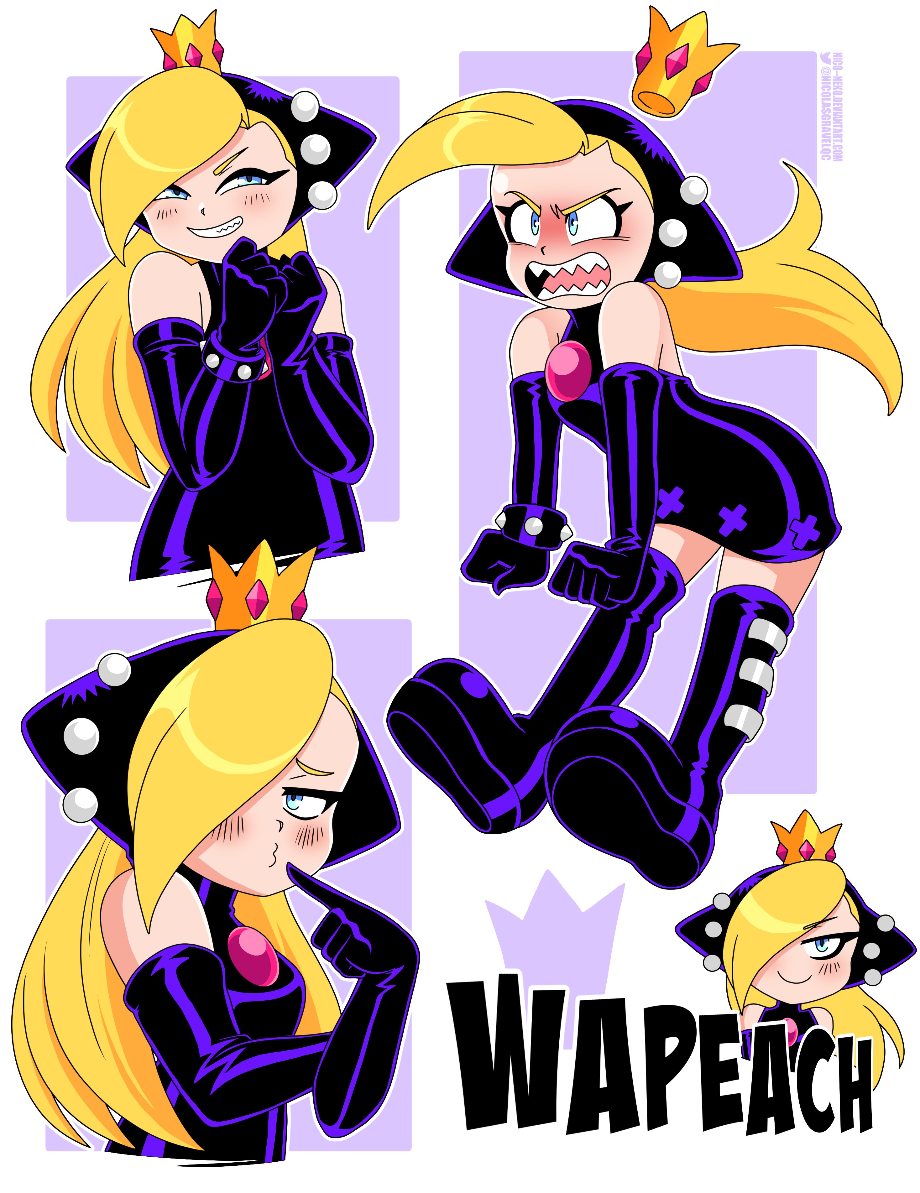 1girl absurdres angry bare_shoulders black_dress black_footwear black_gloves blonde_hair blue_eyes blush boots bracelet brooch cross_cutout crown dress elbow_gloves evil_grin evil_smile full_body gem gloves grin highres hooded_dress jewelry knee_boots latex latex_dress leather_dress long_eyelashes long_hair mario_(series) mario_power_tennis mario_tennis microdress mini_crown nico-neko nintendo o3o petite pointy_ears puckered_lips purple_dress purple_footwear purple_gloves red_gem sharp_teeth sleeveless sleeveless_dress smile spiked_bracelet spikes tantrum teeth warupeach