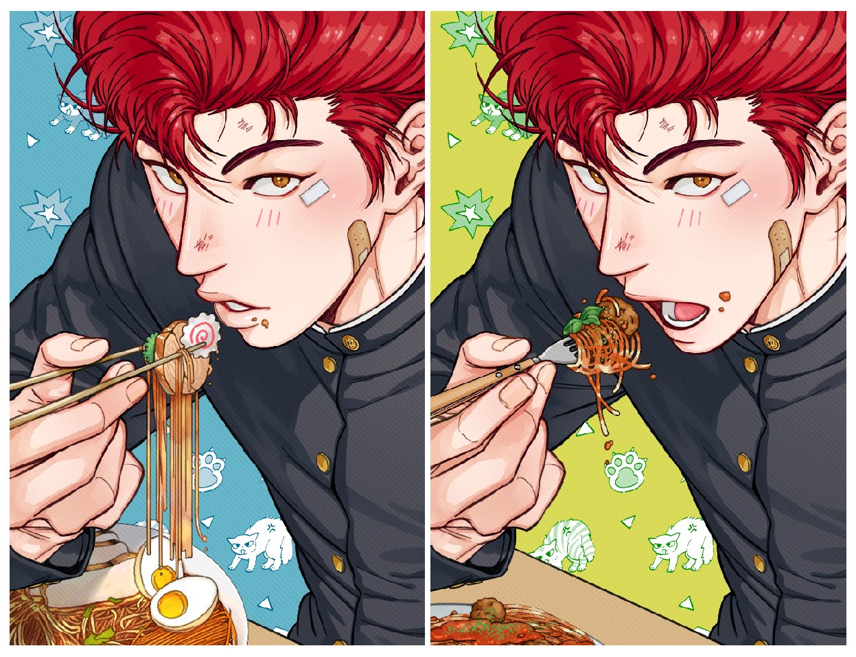 168broccoli 1boy bandaid bandaid_on_cheek bandaid_on_face blush chopsticks close-up dirty dirty_face eating food fork gakuran holding holding_chopsticks holding_fork looking_at_viewer male_focus multiple_views noodles open_mouth pompadour portrait raised_eyebrows red_hair sakuragi_hanamichi school_uniform short_hair slam_dunk_(series)