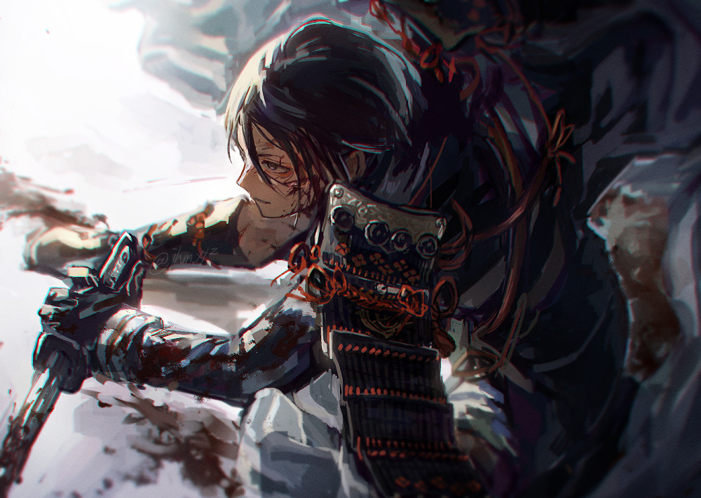 1boy armor battlefield black_hair blood blood_on_clothes blood_on_face blood_on_hands blood_splatter blood_stain bloody_weapon injury japanese_armor jhm_xyz looking_to_the_side male_focus military purple_eyes resting scar scar_on_face short_hair short_sword shoulder_armor sode solo sunlight sword touken_ranbu weapon yagen_toushirou