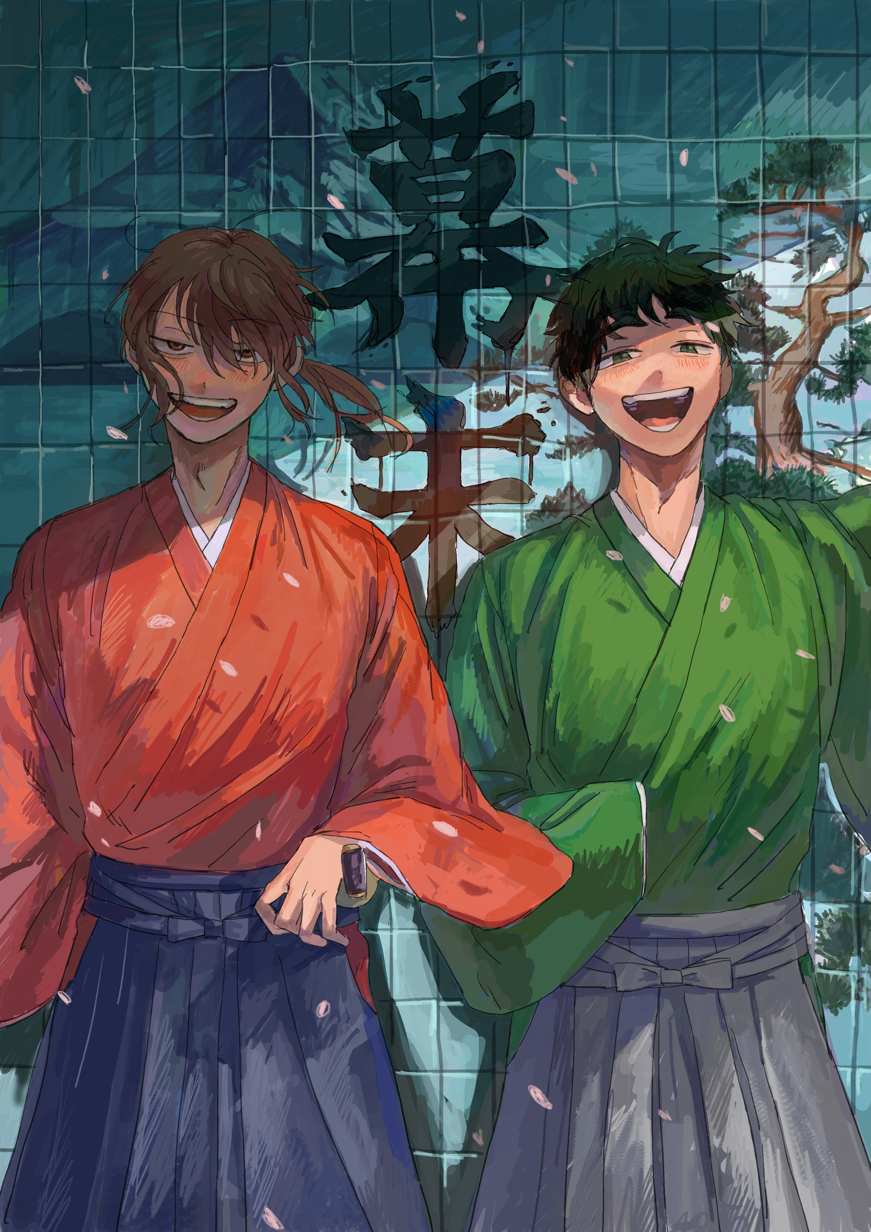 2boys absurdres adam's_apple arm_rest bakumatsu_shishi_channel black_hair blue_hakama blush brown_hair cherry_blossoms commentary_request cowboy_shot falling_petals floating_hair green_eyes grey_hakama hakama half-closed_eyes head_tilt highres japanese_clothes katana kimono long_sleeves looking_at_viewer male_focus mount_fuji multiple_boys mural open_mouth petals ponytail red_eyes red_kimono sakamoto_ryouma_(bakumatsu_shishi_channel) sheath sheathed short_hair side-by-side sleeves_past_fingers sleeves_past_wrists smile standing sword takamori_saigou_(bakumatsu_shishi_channel) thick_eyebrows tile_wall tiles translation_request wai_(aya-hsn-149) weapon wide_sleeves