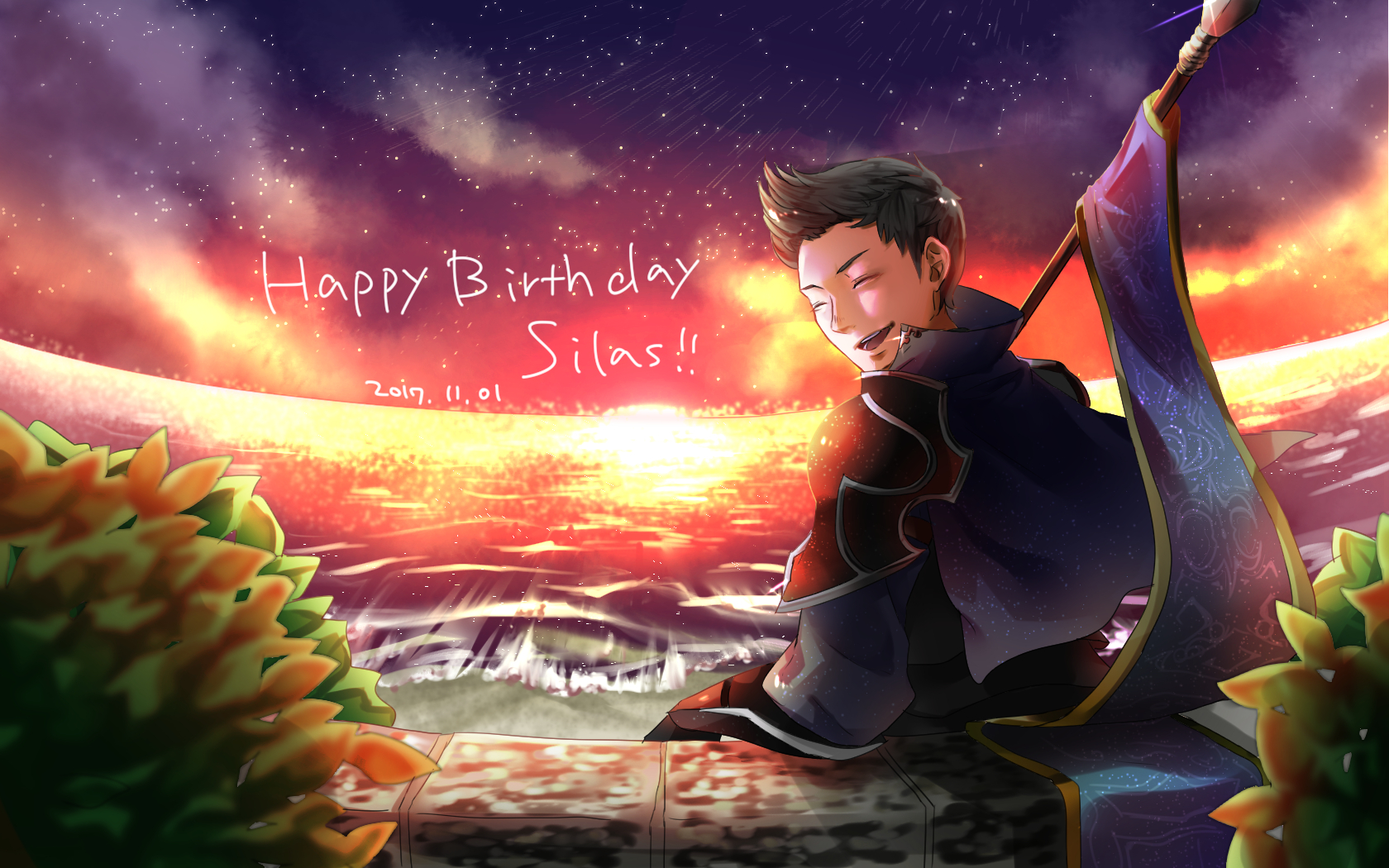 1boy closed_eyes collared_cape dated dusk fire_emblem fire_emblem_fates happy_birthday highres holding holding_polearm holding_weapon kedama_mosamosa male_focus nintendo open_mouth polearm quiff silas_(fire_emblem) sky solo star_(sky) starry_sky weapon