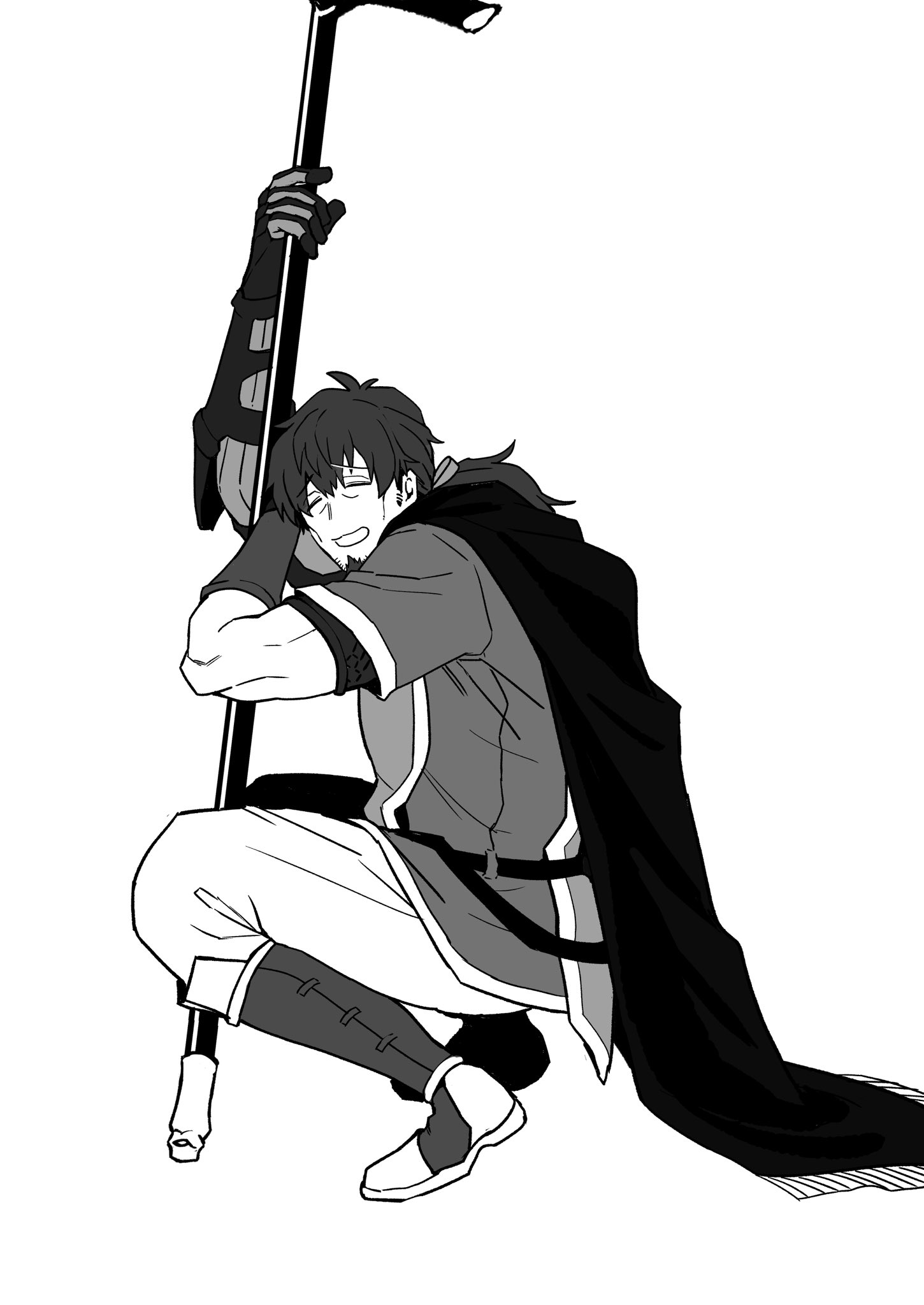 1boy boots cape facial_hair facing_viewer fate/grand_order fate_(series) full_body gloves goatee greyscale grin hair_ribbon haruto_(hit23ewluvnpfo6) hector_(fate) highres holding holding_polearm holding_weapon lance male_focus monochrome pants polearm ponytail ribbon short_hair simple_background smile solo squatting tabard weapon