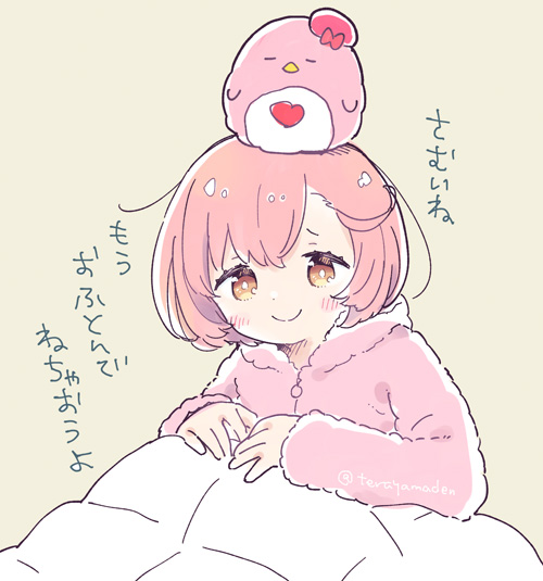 1girl ayase_naru blanket blush brown_eyes closed_mouth commentary_request hood hood_down long_sleeves looking_at_viewer object_on_head pink_hair pretty_rhythm pretty_rhythm_rainbow_live pretty_series short_hair simple_background smile solo stuffed_animal stuffed_penguin stuffed_toy terayamaden translation_request under_covers upper_body