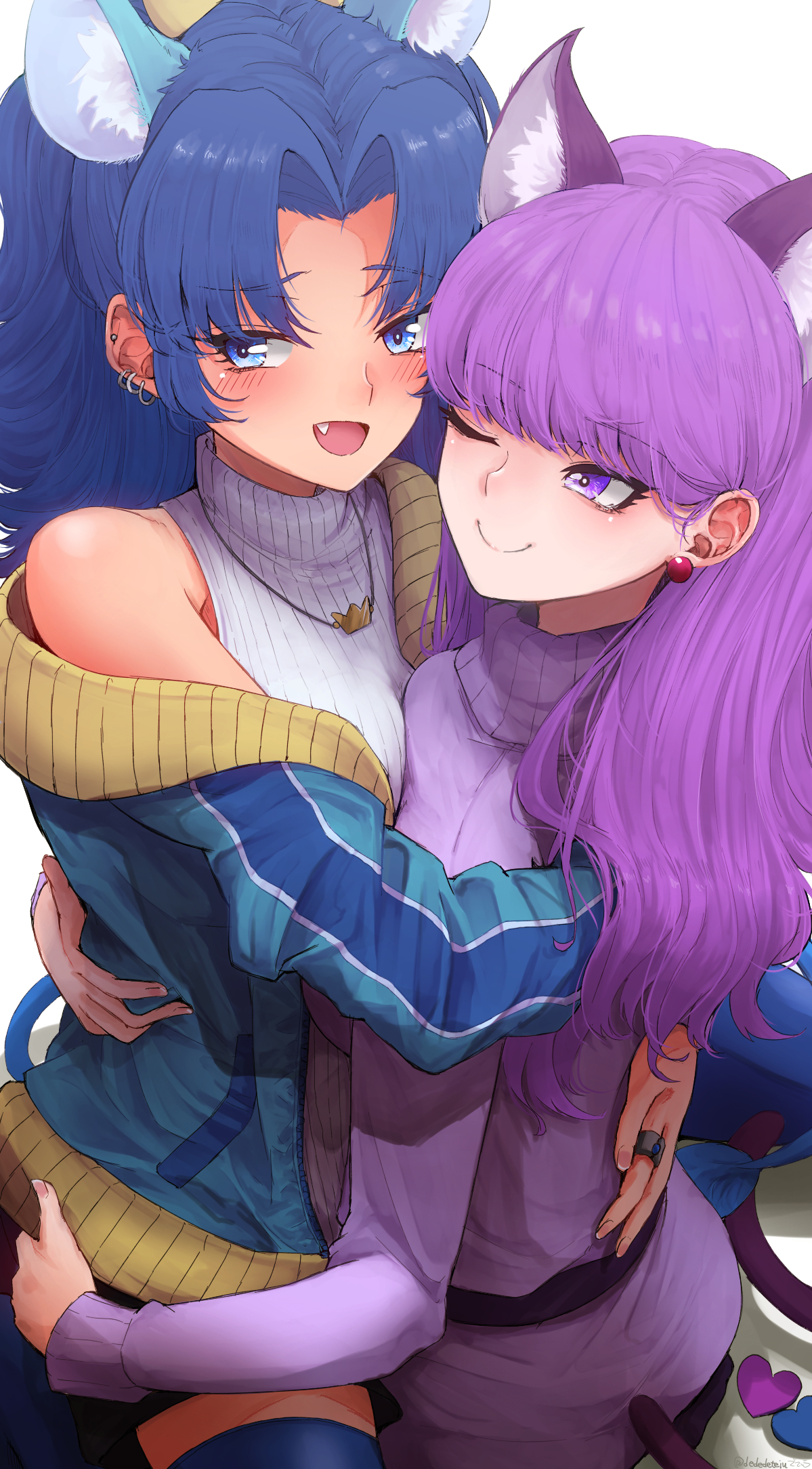 2girls aged_up alternate_costume animal_ears blue_eyes blue_hair blue_thighhighs blush breasts cat_day cat_ears cat_tail dededeteiu earrings extra_ears fang highres jacket jewelry kirakira_precure_a_la_mode kotozume_yukari lion_ears lion_tail long_hair medium_breasts multiple_girls necklace open_mouth precure purple_eyes purple_hair ribbed_shirt shirt sleeveless sleeveless_shirt smile tail tategami_aoi thighhighs white_shirt