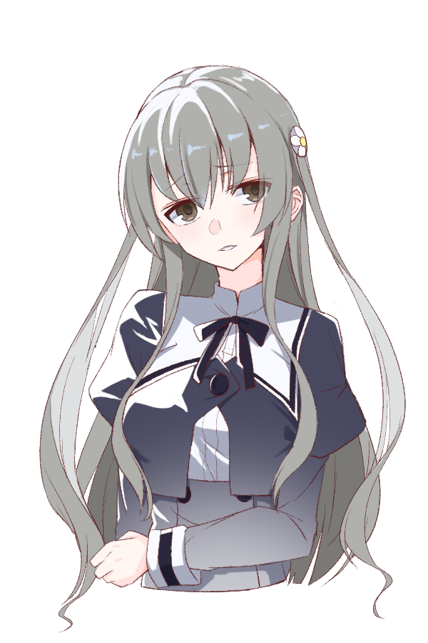1girl arm_at_side assault_lily black_ribbon black_skirt breasts brown_eyes buttons commentary_request cropped_jacket cropped_torso egawa_kusumi flower grey_hair gumoyu hair_between_eyes hair_flower hair_ornament hand_on_own_arm high-waist_skirt juliet_sleeves large_breasts light_blush long_hair long_sleeves looking_at_viewer neck_ribbon parted_lips puffy_sleeves raised_eyebrows ribbon school_uniform shirt sidelocks simple_background skirt solo two_side_up upper_body very_long_hair white_background white_flower white_shirt yurigaoka_girls_academy_school_uniform