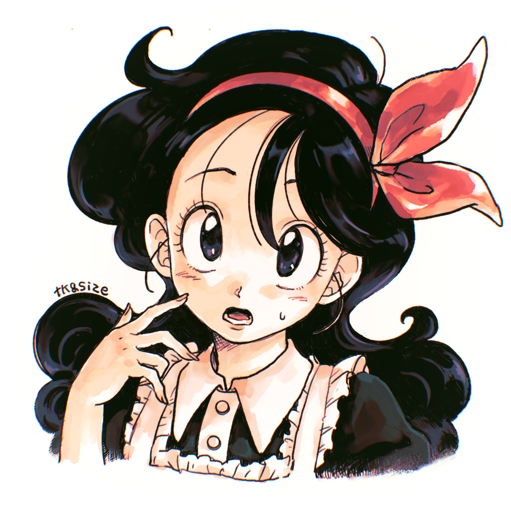 1girl apron artist_name black_eyes black_hair commentary cropped_shoulders curly_hair dragon_ball fingernails frilled_apron frills hair_ribbon hairband hand_up highres long_hair looking_at_viewer lunch_(dragon_ball) lunch_(good)_(dragon_ball) maid_apron open_mouth red_hairband red_ribbon ribbon simple_background solo swept_bangs tkgsize white_background worried