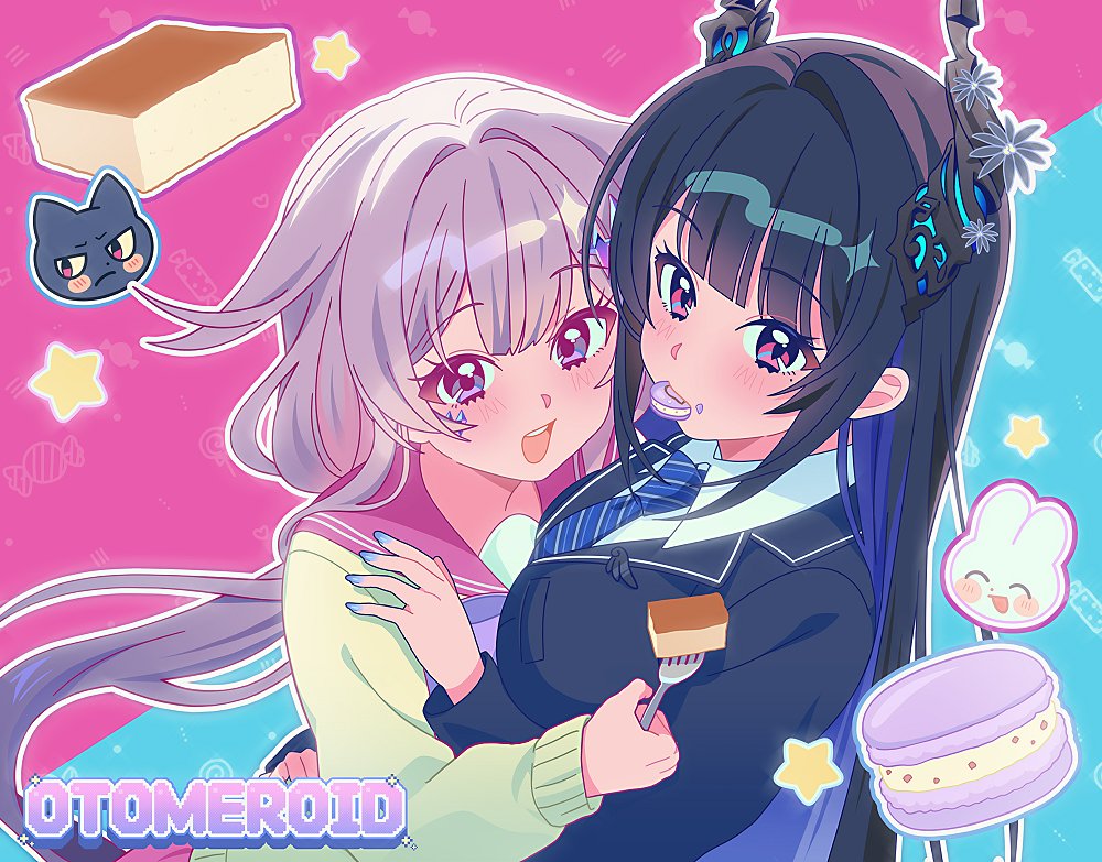 2girls asymmetrical_horns averting_eyes black_hair blazer blue_hair blush breasts cat collared_shirt colored_inner_hair demon_horns dress food food_in_mouth fork grey_hair holding holding_fork hololive hololive_english horns hug jacket jewel_under_eye koseki_bijou large_breasts long_hair long_sleeves macaron memu_0113 mole mole_under_eye mouth_hold multicolored_hair multiple_girls nail_polish necktie nerissa_ravencroft open_mouth purple_eyes rabbit red_eyes sailor_collar shirt smile virtual_youtuber