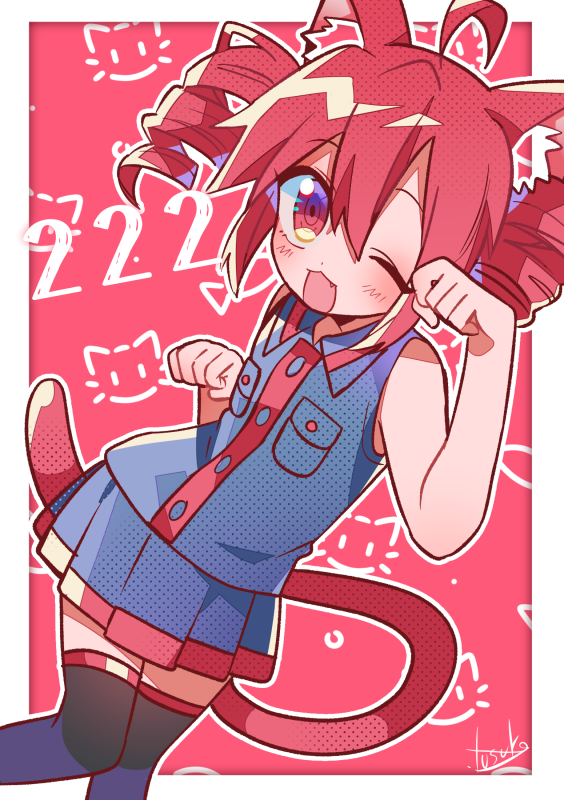 1girl :3 ahoge animal_ear_fluff animal_ears blush cat_day cat_ears cat_girl cat_tail collared_shirt drill_hair fang kasane_teto kasane_teto_(utau) looking_at_viewer one_eye_closed open_mouth paw_pose pink_eyes pink_hair pleated_skirt shirt skirt sleeveless sleeveless_shirt smile solo tail thighhighs twin_drills utau yuusuke-kun
