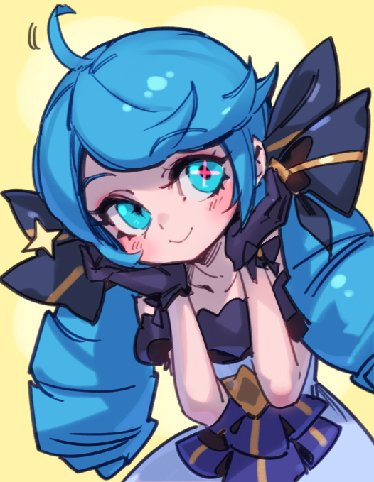 1girl black_bow blush bow breasts collarbone dress drill_hair gloves gwen_(league_of_legends) hair_bow hands_up league_of_legends long_hair looking_at_viewer phantom_cross smile solo twin_drills twintails