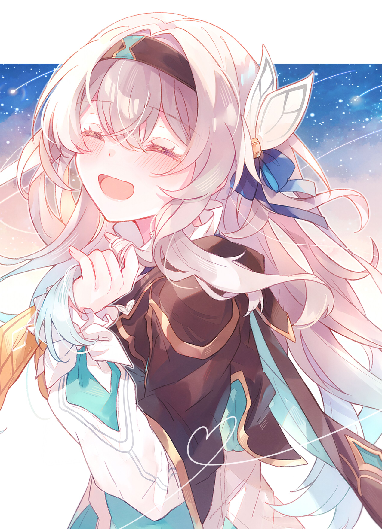 1girl 247_(nsn_na7) black_hairband blue_ribbon brown_jacket closed_eyes facing_viewer firefly_(honkai:_star_rail) gold_trim hair_ribbon hairband hand_up heart highres honkai:_star_rail honkai_(series) jacket long_hair long_sleeves open_mouth ribbon shirt shooting_star sidelocks smile solo upper_body white_background white_hair white_shirt
