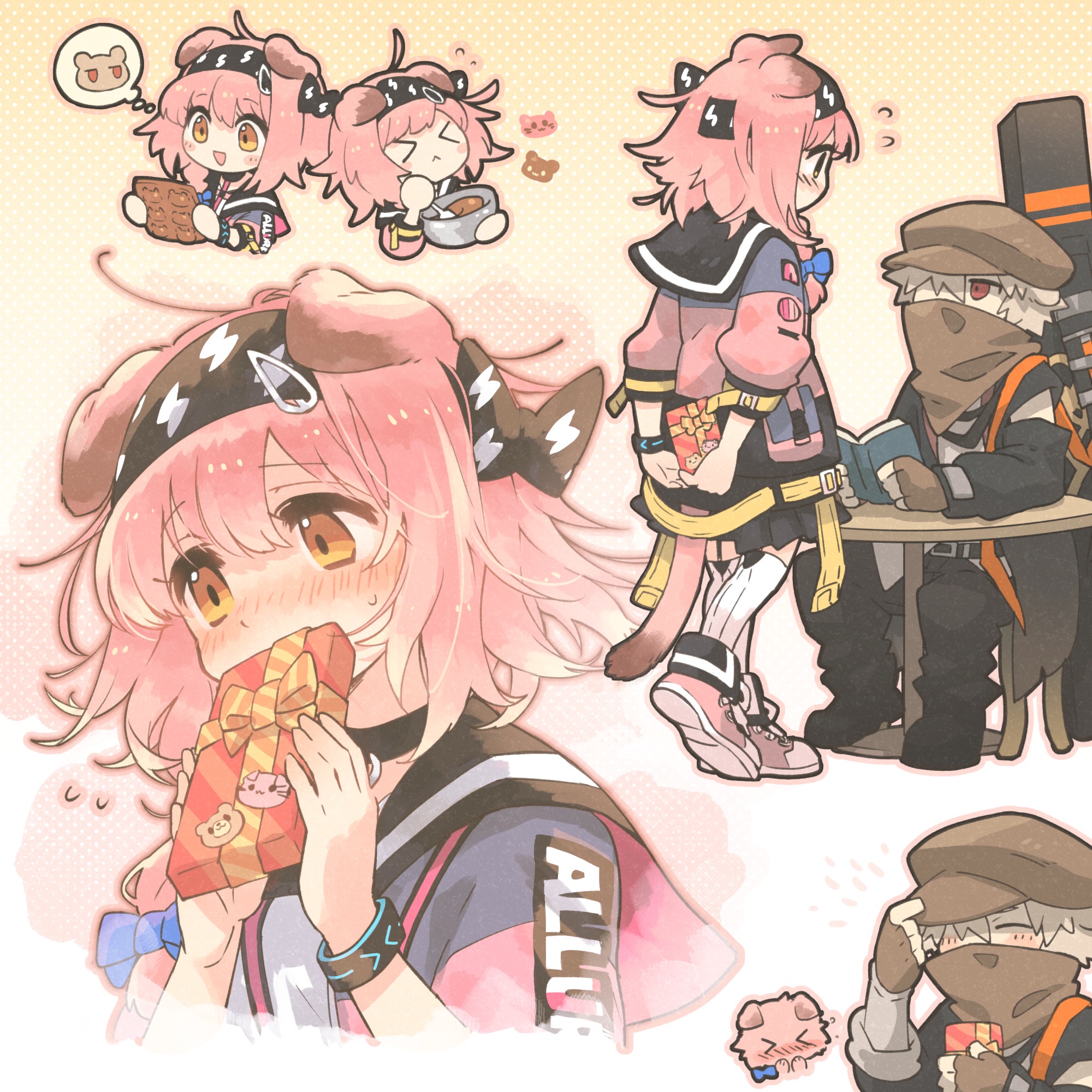 >_< 1boy 1girl animal_ears arknights arm_cutout arms_behind_back black_hairband black_jacket black_sailor_collar blue_bow book bow braid brown_gloves brown_headwear brown_scarf cat_ears cat_girl chair chibi chibi_inset chocolate chocolate_making closed_mouth clothing_cutout commentary_request covering_own_mouth embarrassed fingerless_gloves full_body gift giving gloves goldenglow_(arknights) gradient_background grey_hair hair_bow hairband happy heart highres holding holding_book holding_spoon infection_monitor_(arknights) jacket lightning_bolt_print morini_ochiteru pink_hair pink_jacket reading red_(npc)_(arknights) red_eyes sailor_collar scarf scarf_over_mouth shirt short_hair side_braid sitting speech_bubble spoon table thought_bubble upper_body valentine white_background white_shirt yellow_background yellow_eyes