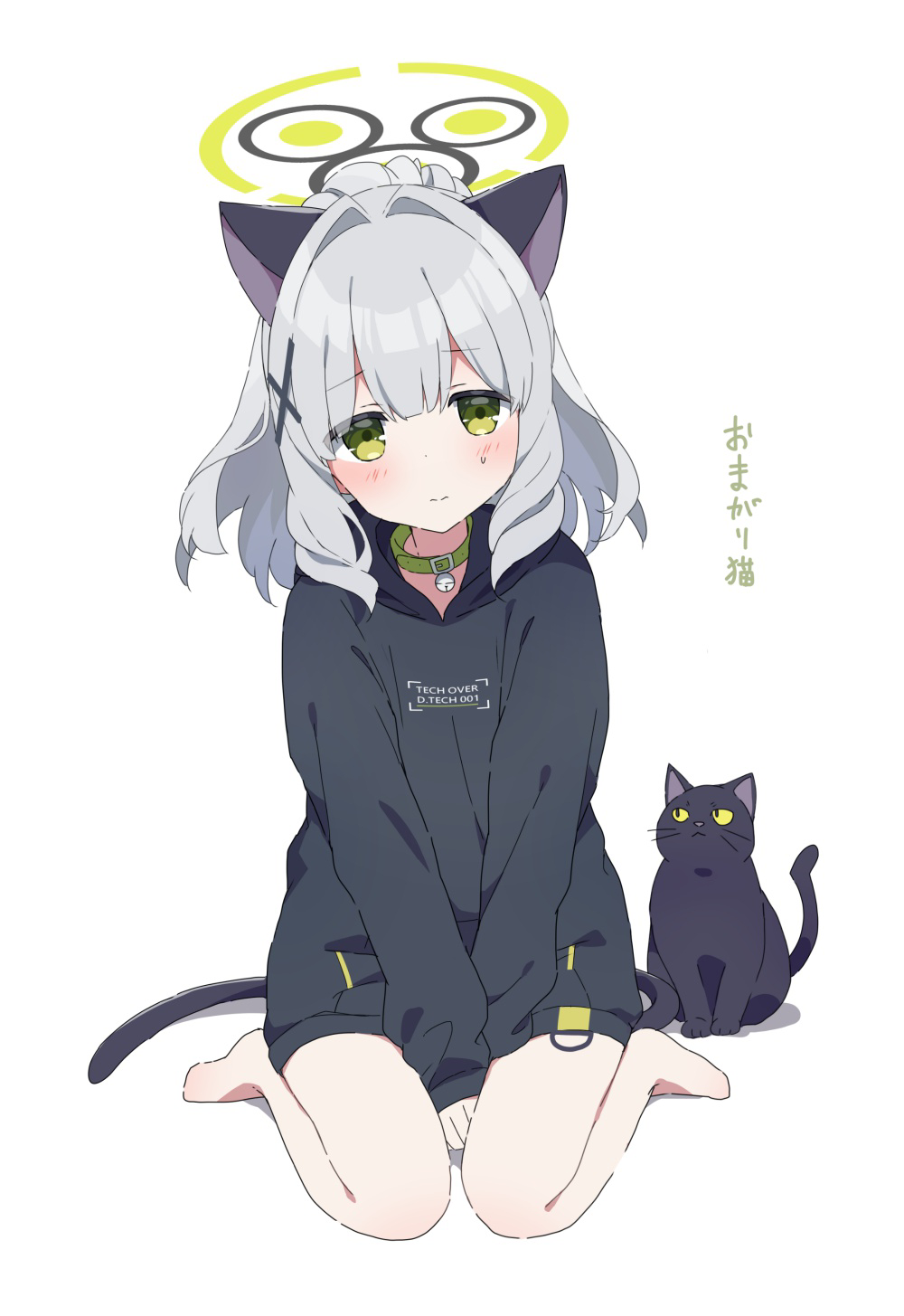1girl animal_ears barefoot bell between_legs black_cat blue_archive blush cat cat_ears cat_tail choker green_eyes grey_hair halo hare_(blue_archive) highres long_sleeves mochigome_(ununquadium) simple_background sitting tail wariza white_background