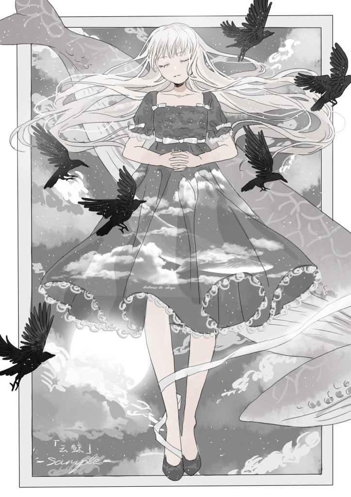 1girl animal_print bare_arms bare_legs bird bity3155660241 blunt_bangs border bow closed_eyes closed_mouth cloud cloud_print collarbone commentary_request crow dress dress_bow expressionless eyelashes fish_print floating_hair frilled_sleeves frills full_body grey_dress grey_shoes grey_sky grey_sleeves interlocked_fingers lace lace-trimmed_dress lace_trim leg_ribbon long_hair medium_dress original outside_border own_hands_together pleated_dress puffy_short_sleeves puffy_sleeves ribbon sample_watermark shoes short_sleeves sky sleeve_bow solo star_(sky) starry_sky starry_sky_print straight-on sun very_long_hair waist_bow watermark whale whale_print white_border white_bow white_hair white_ribbon