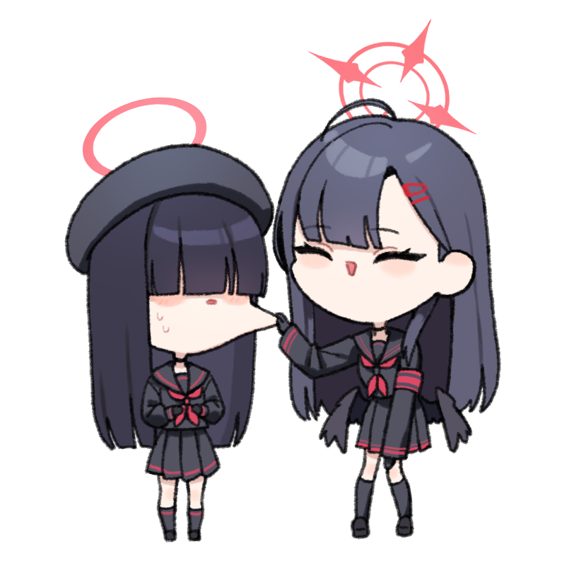 28_(282teeth) 2girls armband beret black_footwear black_hair black_headwear black_sailor_collar black_serafuku black_socks blue_archive closed_eyes hair_ornament hairclip halo hat ichika_(blue_archive) justice_task_force_member_(blue_archive) long_hair long_sleeves multiple_girls neckerchief open_mouth red_armband red_halo red_neckerchief sailor_collar school_uniform serafuku shoes simple_background smile socks white_background