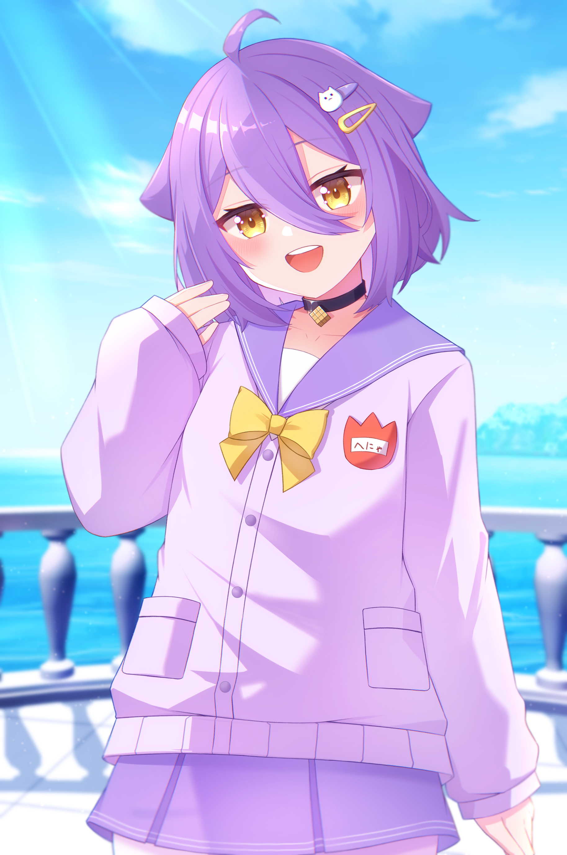 1girl absurdres black_choker blue_sky blush choker cloud gradient_hair grey_hair hair_ornament hairpin henya_the_genius henya_the_genius_(school_uniform) henya_the_genius_(school_uniform) highres iyotsuki11 multicolored_hair open_mouth purple_hair purple_sailor_collar purple_skirt sailor_collar shirt short_hair skirt sky smile solo teeth upper_teeth_only virtual_youtuber vshojo white_shirt yellow_eyes