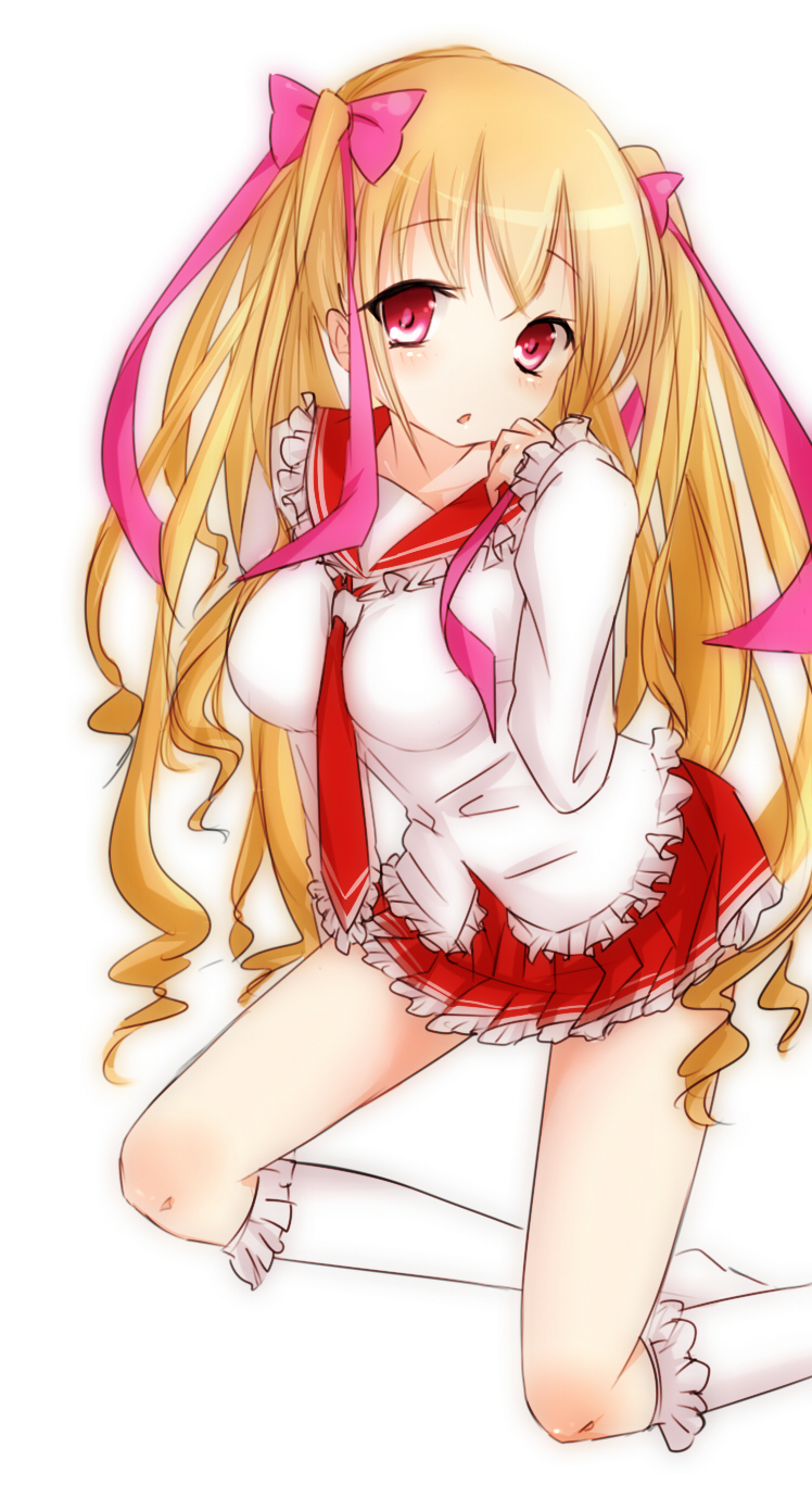 1girl ascot blonde_hair blush breasts frilled_shirt frilled_skirt frilled_sleeves frilled_socks frills hair_ribbon hidan_no_aria highres kneeling large_breasts long_hair looking_at_viewer mine_riko no_nose nobinonki open_mouth pink_ribbon pleated_skirt red_eyes red_sailor_collar red_skirt ribbon sailor_collar shirt sidelocks simple_background skirt socks twintails white_background