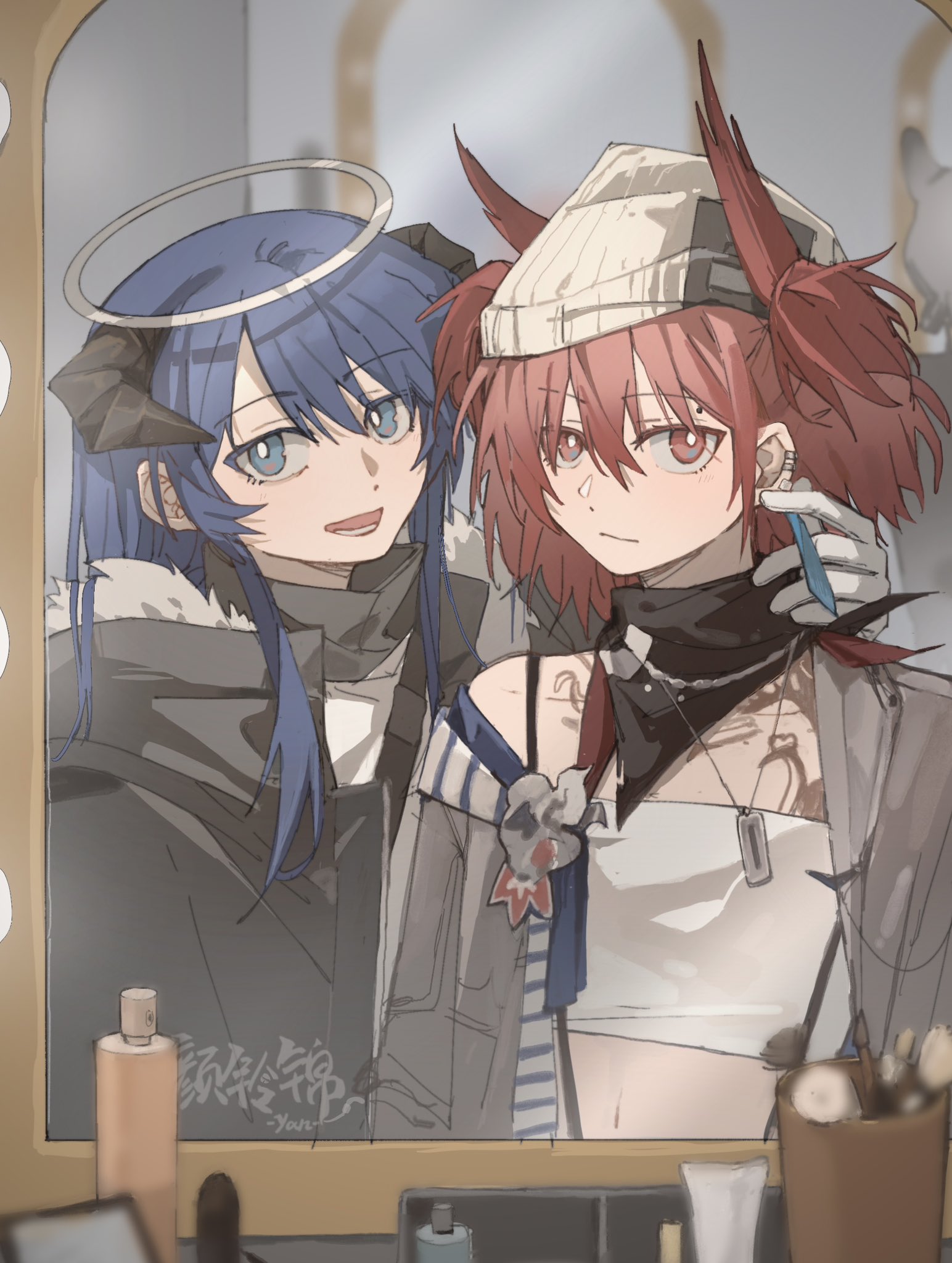 2girls arknights bandeau beanie black_coat black_scarf blue_eyes blue_hair bottle bright_pupils closed_mouth coat commentary dog_tags ear_piercing earrings feather_hair fiammetta_(arknights) grey_jacket halo hat highres horns jacket jewelry long_hair looking_at_viewer makeup_brush medium_hair mirror mostima_(arknights) multiple_girls off_shoulder open_mouth piercing red_eyes red_hair reflection scarf smile spray_bottle two_side_up white_bandeau white_headwear white_pupils yanlingjinshilihuahua yuri