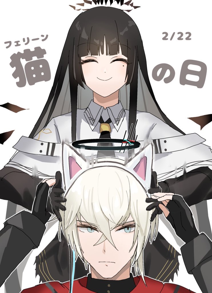 1boy 1girl ^_^ animal_ear_headphones animal_ears arknights arms_up black_gloves black_hair black_necktie blue_eyes brown_wings cat_ear_headphones cat_ears closed_eyes closed_mouth collared_jacket commentary_request dated detached_wings executor_(arknights) executor_the_ex_foedere_(arknights) fake_animal_ears fingerless_gloves gloves hair_between_eyes halo headphones horobu jacket layered_sleeves long_hair long_sleeves mole mole_under_eye necktie short_over_long_sleeves short_sleeves simple_background translation_request very_long_hair virtuosa_(arknights) white_background white_jacket wings