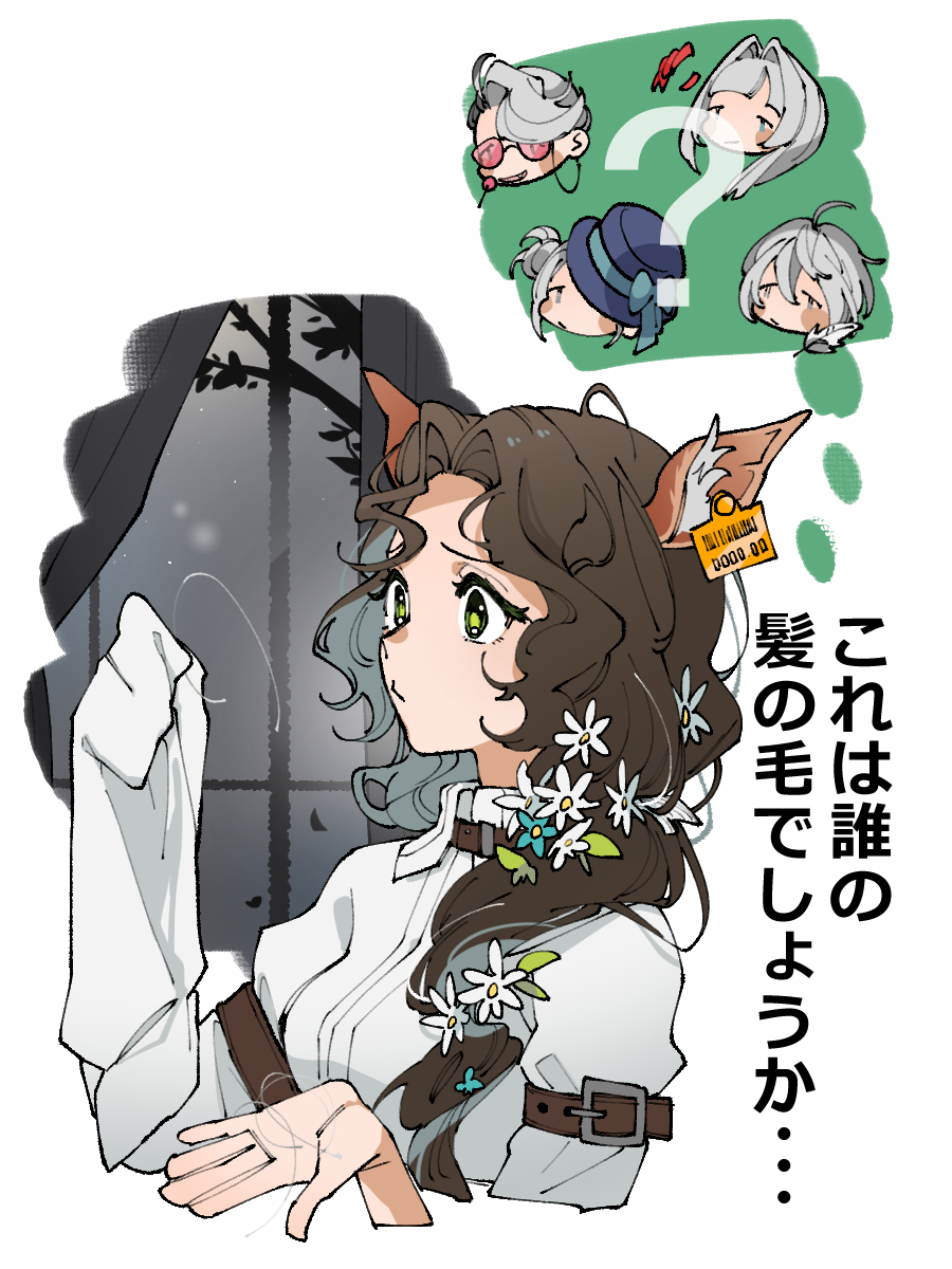 2boys 3girls :/ ? animal_ears boater_hat brown_hair chibi chibi_inset cropped_torso deer_ears deer_girl dikke_(reverse:1999) ear_tag flower furrowed_brow green_eyes grey_hair hair_flower hair_ornament hair_over_shoulder hands_up highres holding_another's_hair image_in_thought_bubble jessica_(reverse:1999) kaeru_(uj26cobrsv) long_hair long_sleeves multiple_boys multiple_girls pavia_(reverse:1999) purple-tinted_eyewear purple_headwear reverse:1999 shirt short_hair sleeves_past_fingers sleeves_past_wrists solo_focus speech_bubble thinking thought_bubble tinted_eyewear upper_body vertin_(reverse:1999) white_background white_flower white_shirt zima_(reverse:1999)