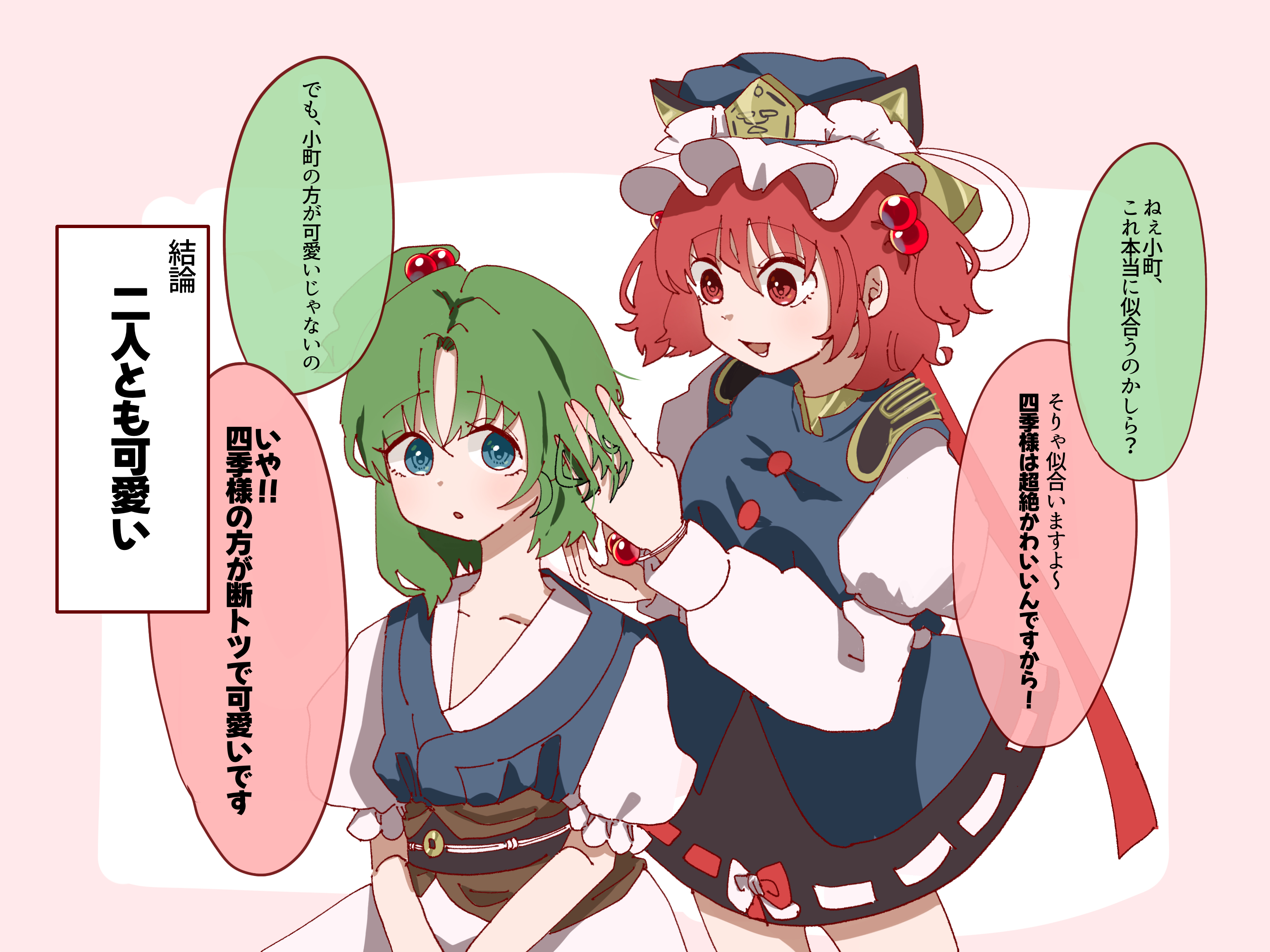 2girls aqua_eyes black_skirt blue_headwear collarbone commentary_request cosplay costume_switch eik_s2 epaulettes green_hair hair_bobbles hair_ornament highres juliet_sleeves long_sleeves looking_at_viewer multiple_girls obi obidome obijime one_side_up onozuka_komachi onozuka_komachi_(cosplay) puffy_sleeves red_eyes red_hair ribbon-trimmed_skirt ribbon_trim sash shiki_eiki shiki_eiki_(cosplay) short_hair short_sleeves skirt speech_bubble touhou translation_request two-tone_background two_side_up