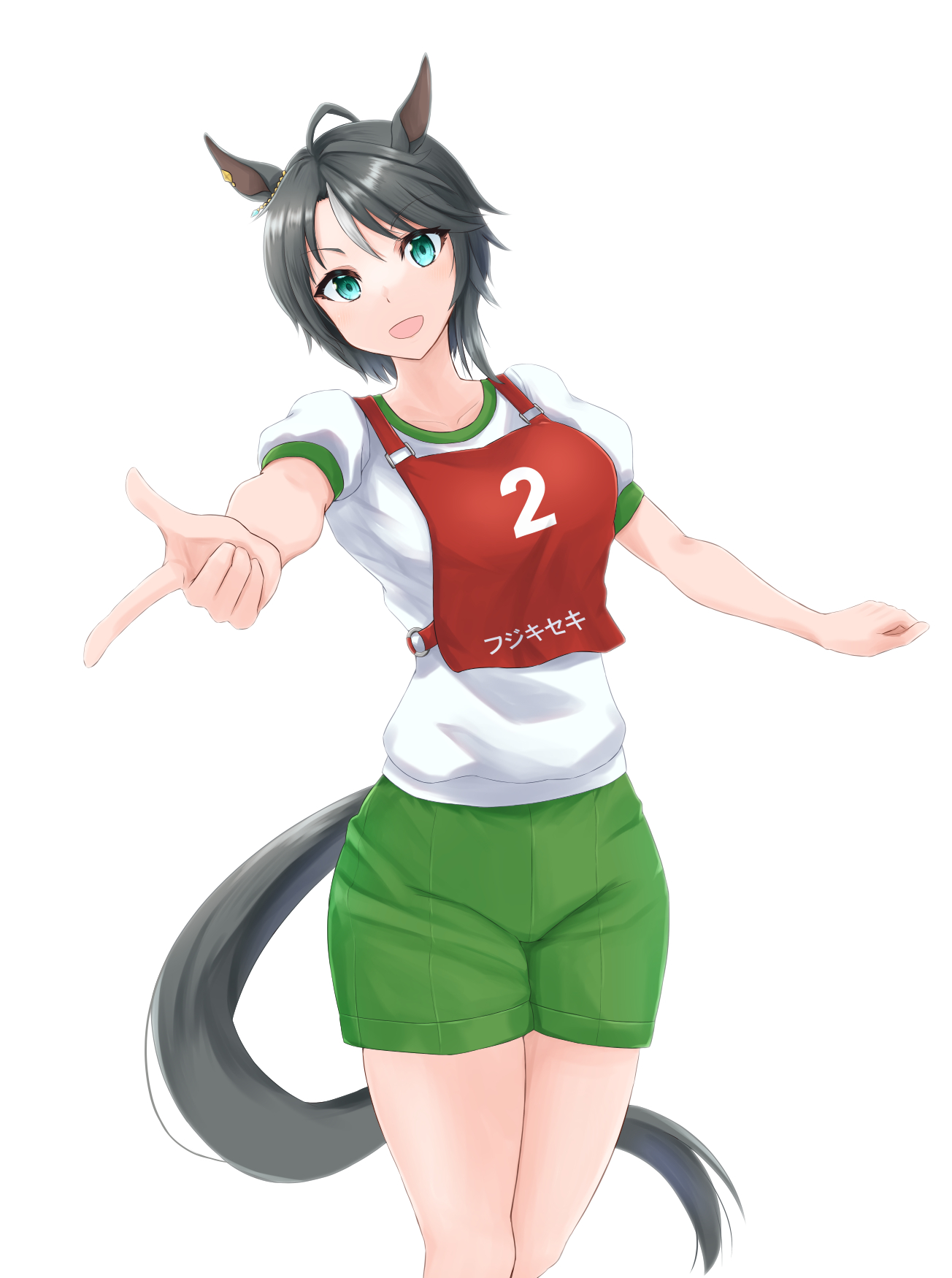 1girl animal_ears black_hair character_name commentary ear_ornament fuji_kiseki_(umamusume) green_shorts highres horse_ears horse_girl kemuri_(etep3372) looking_at_viewer multicolored_hair open_mouth pointing pointing_at_viewer race_bib shirt short_hair short_sleeves shorts simple_background smile solo standing streaked_hair t-shirt translated umamusume white_background white_shirt