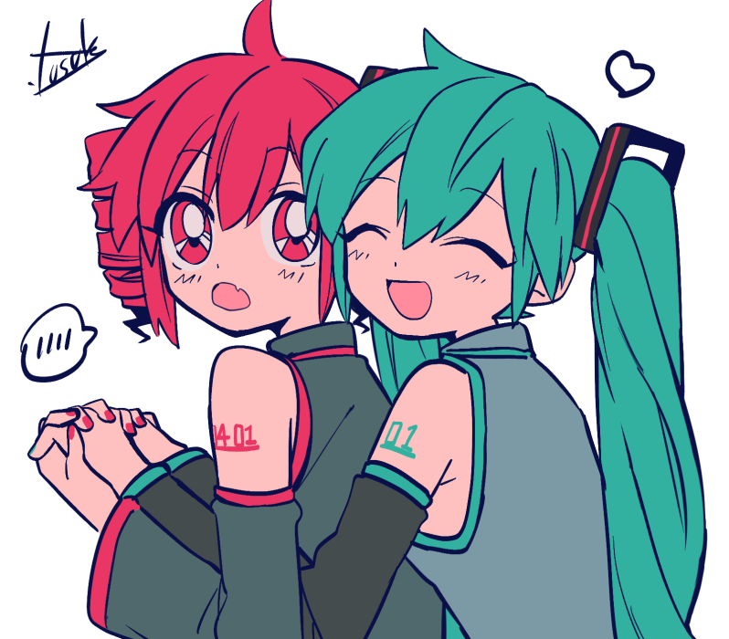 1990s_(style) 2girls ahoge aqua_hair aqua_trim arm_tattoo armpit_crease artist_name bare_shoulders black_shirt black_sleeves closed_eyes collared_shirt detached_sleeves drill_hair fang from_behind grey_shirt hair_between_eyes hair_ornament hatsune_miku heart interlocked_fingers kasane_teto kasane_teto_(utau) long_hair long_sleeves looking_back multiple_girls nail_polish number_tattoo open_mouth red_eyes red_hair red_nails red_trim retro_artstyle shirt short_hair skin_fang sleeveless sleeveless_shirt smile spoken_blush tattoo twin_drills twintails utau vocaloid white_background yuri yuusuke-kun
