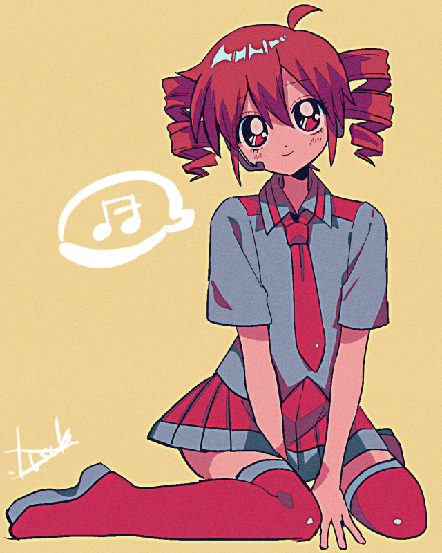 1990s_(style) 1girl ahoge alternate_costume arms_between_legs artist_name boots closed_mouth collared_shirt drill_hair grey_shirt grey_trim hair_between_eyes headphones headset kasane_teto looking_at_viewer musical_note necktie red_eyes red_footwear red_hair red_necktie red_skirt red_trim retro_artstyle shirt short_hair short_sleeves sitting skirt smile spoken_musical_note thigh_boots twin_drills utau yellow_background yuusuke-kun