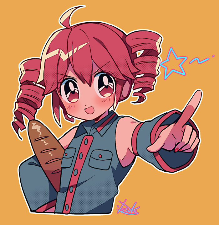 1990s_(style) 1girl ahoge artist_name baguette bare_shoulders black_shirt black_sleeves bread buttons collared_shirt cropped_torso detached_sleeves drill_hair food foreshortening hair_between_eyes index_finger_raised kasane_teto kasane_teto_(utau) long_sleeves nail_polish open_mouth orange_background outline red_eyes red_hair red_nails red_trim retro_artstyle shirt short_hair sleeveless sleeveless_shirt smile solo twin_drills utau v-shaped_eyebrows white_outline yuusuke-kun