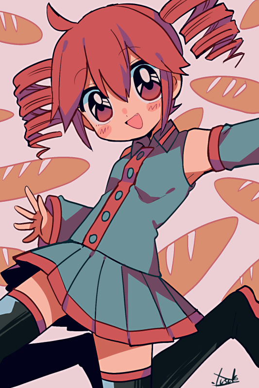 1990s_(style) 1girl ahoge artist_name baguette bare_shoulders black_boots boots bread breasts buttons collared_shirt detached_sleeves drill_hair fang food grey_shirt grey_skirt grey_sleeves hair_between_eyes kasane_teto kasane_teto_(utau) long_sleeves looking_at_viewer open_mouth pleated_skirt red_eyes red_hair red_trim retro_artstyle shirt short_hair skirt sleeveless sleeveless_shirt small_breasts smile solo thigh_boots twin_drills utau yuusuke-kun