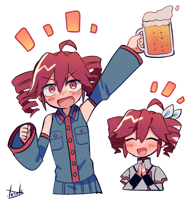 2girls ahoge alcohol arm_up artist_name bare_shoulders beer beer_mug bow closed_eyes collared_shirt cup detached_sleeves drill_hair dual_persona grey_jacket grey_shirt grey_skirt hair_between_eyes hair_bow holding holding_cup jacket kasane_teto kasane_teto_(sv) kasane_teto_(utau) long_sleeves mug multiple_girls open_mouth red_eyes red_hair red_trim shirt short_hair shoulder_belt skirt sleeveless sleeveless_shirt synthesizer_v turtleneck twin_drills utau v-shaped_eyebrows white_background white_bow yuusuke-kun