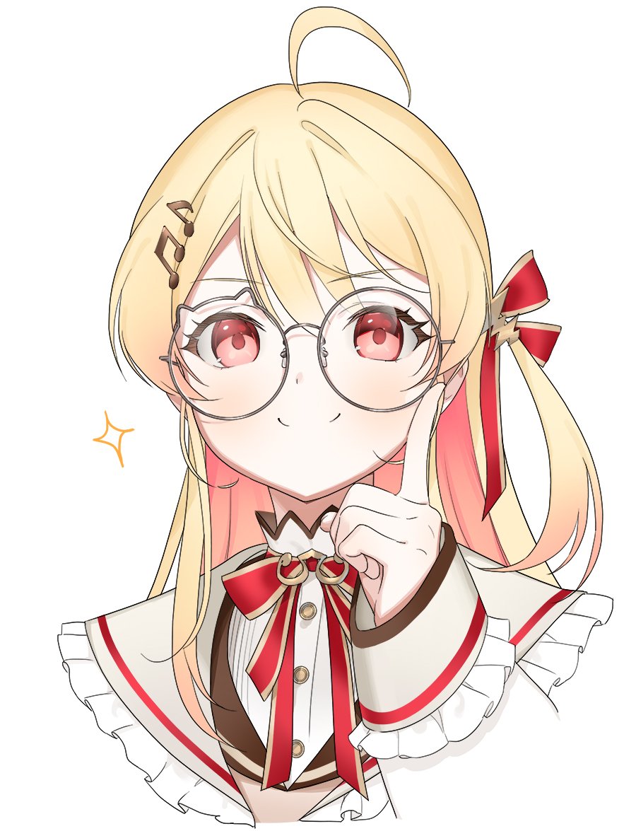 1girl adjusting_eyewear ahoge blonde_hair fortissimo glasses hair_ornament hololive hololive_dev_is long_hair musical_note musical_note_hair_ornament otonose_kanade otonose_kanade_(1st_costume) portrait red_eyes smile sparkle virtual_youtuber white_background zeroperpect