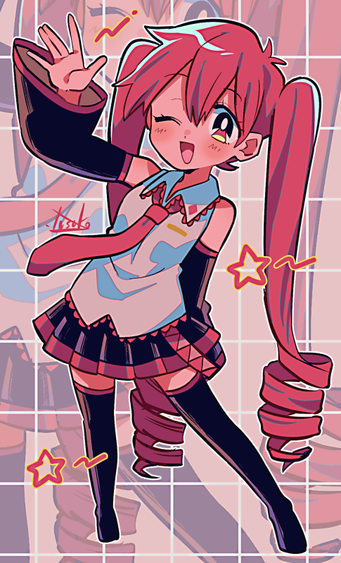 1990s_(style) 1girl antenna_hair arm_at_side arm_up artist_name bare_shoulders black_boots black_skirt black_sleeves boots collared_shirt detached_sleeves drill_hair frilled_shirt frilled_shirt_collar frills fusion grey_shirt hair_behind_ear hair_between_eyes hatsune_miku kasane_teto long_hair long_sleeves looking_at_viewer necktie one_eye_closed open_mouth red_eyes red_hair red_necktie red_trim retro_artstyle shirt skirt sleeveless sleeveless_shirt smile solo thigh_boots twin_drills twintails utau vocaloid yuusuke-kun