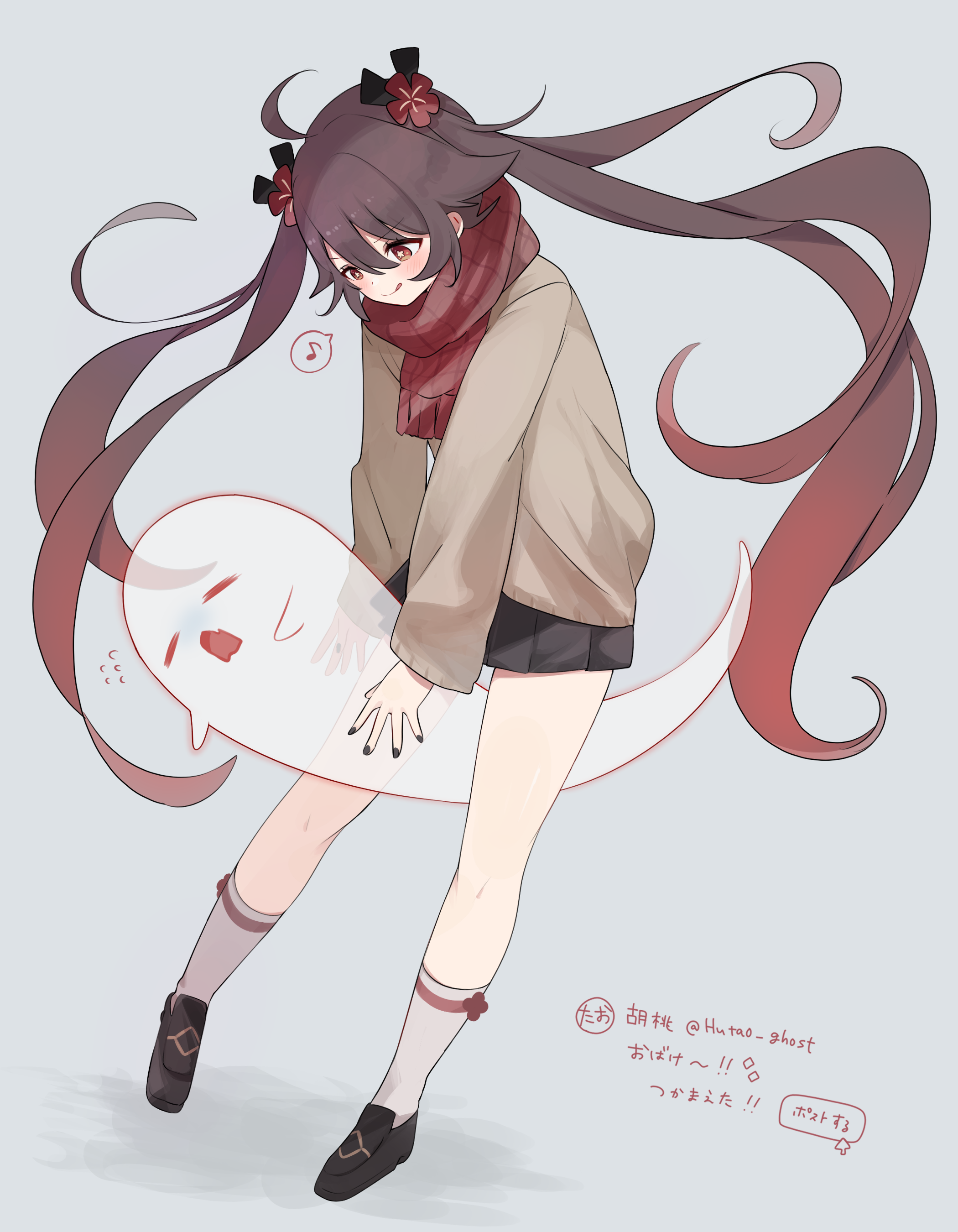 1girl :q absurdres ahoge alternate_costume black_nails blush boo_tao_(genshin_impact) brown_hair brown_sweater engasaki_sakura flower-shaped_pupils full_body genshin_impact ghost hair_between_eyes hair_ornament highres hu_tao_(genshin_impact) long_hair long_sleeves musical_note missing_headwear red_eyes red_scarf scarf simple_background smile solo spoken_musical_note sweater symbol-shaped_pupils tongue tongue_out translation_request twintails winter_clothes