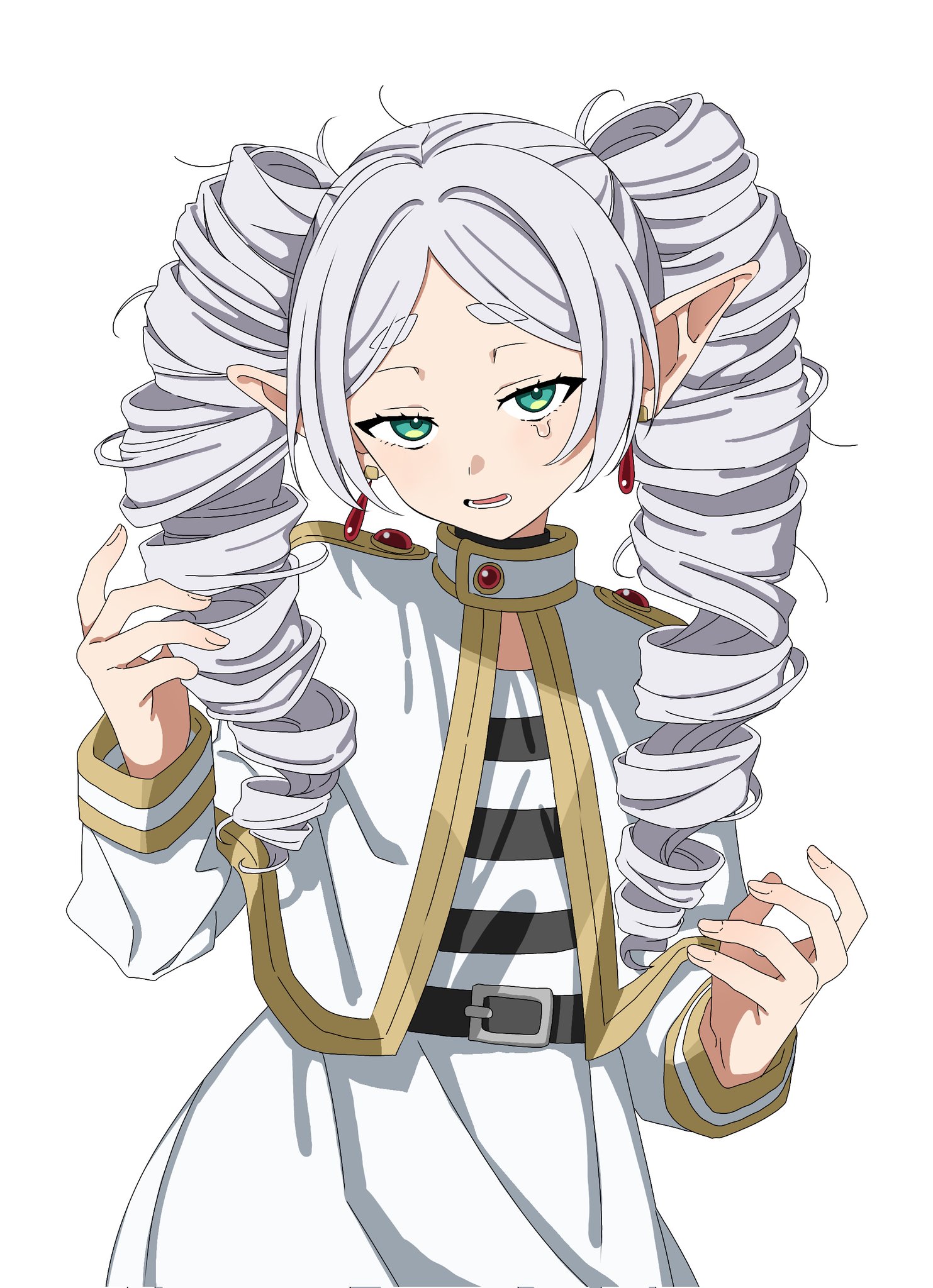 1girl capelet drill_hair earrings elf floating_earrings frieren green_eyes highres jewelry kayuu_(hikentai0112) long_hair long_sleeves looking_at_viewer loose_hair_strand messy_hair open_mouth parted_bangs pointy_ears shirt solo sousou_no_frieren striped_clothes striped_shirt thick_eyebrows twin_drills twintails white_capelet white_hair