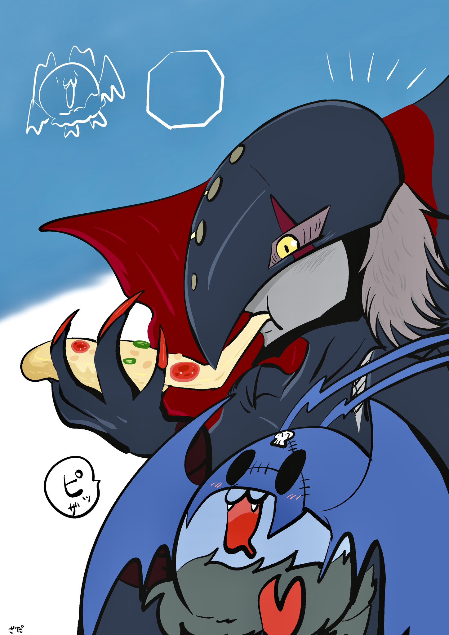 apocalymon apocalymon_finally_gets_the_pizza_(meme) digimon digimon_(creature) eating food highres looking_at_another meme open_mouth picodevimon pizza skull wings