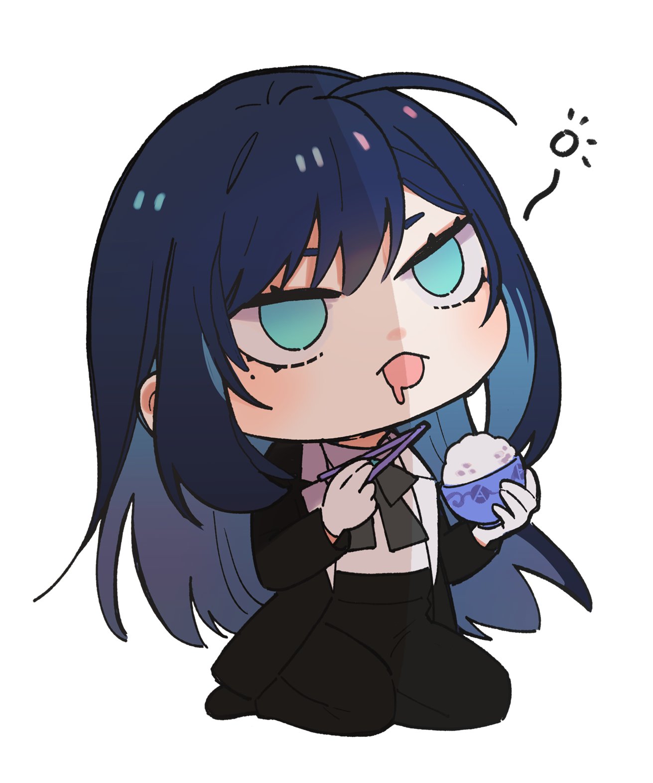 1girl ado_(utaite) ahoge black_bow black_bowtie black_coat black_footwear black_pants blue_eyes blue_hair blush bow bowl bowtie chando_(ado) chopsticks cloud_nine_inc coat colored_inner_hair commentary drooling full_body gloves hashtag-only_commentary highres holding holding_bowl holding_chopsticks long_hair long_sleeves mole mole_under_eye mouth_drool multicolored_hair open_clothes open_coat open_mouth pants rice riseno seiza shade shirt sidelocks simple_background sitting solo squeans utaite white_background white_gloves white_shirt