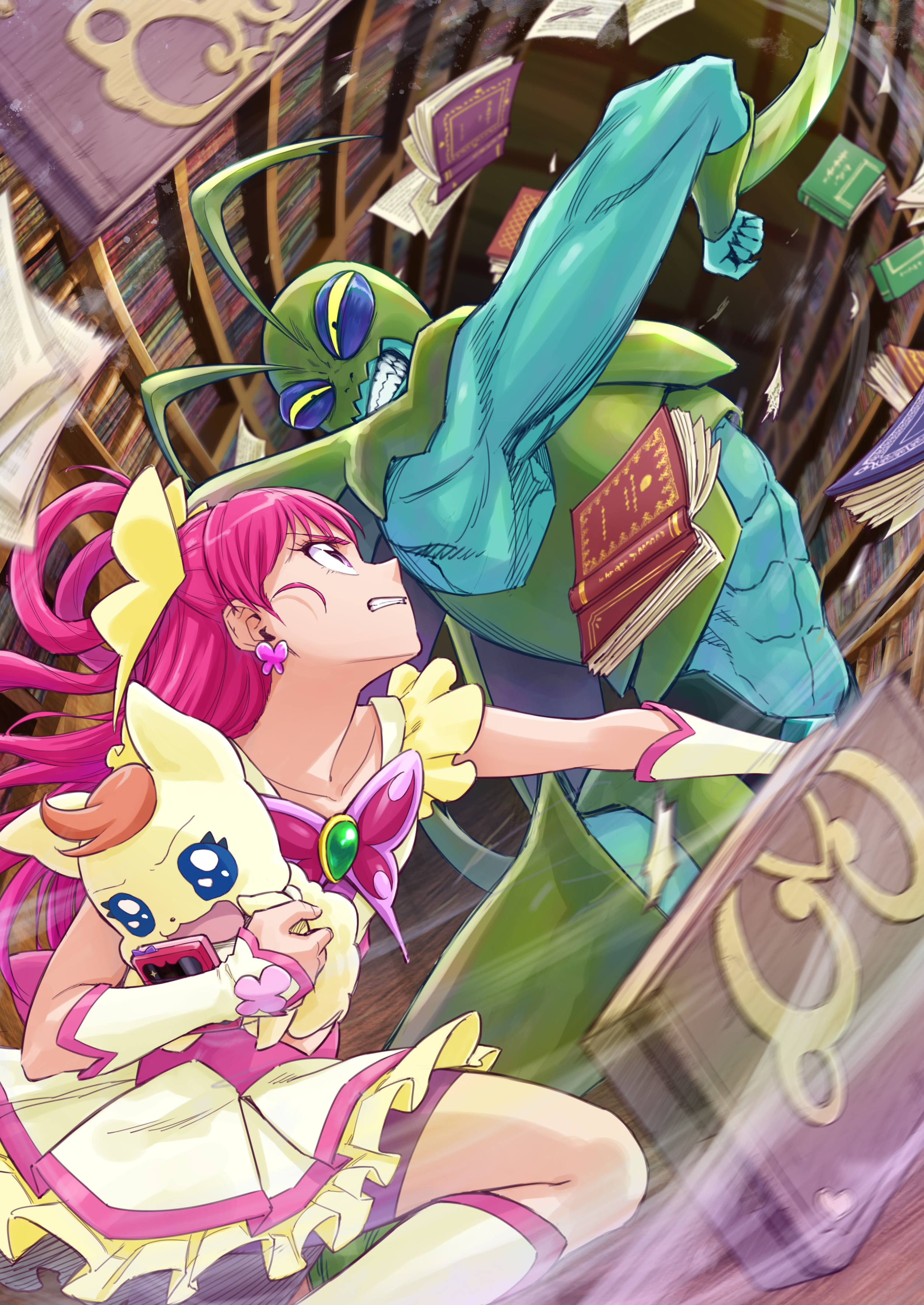 1boy 1girl absurdres angry arm_warmers armor battle bike_shorts bike_shorts_under_skirt blue_skin book boots brooch butterfly_brooch clenched_teeth coco_(precure) colored_sclera colored_skin creature cure_dream earrings eye_contact frilled_skirt frills girinma glaring green_armor hair_rings highres indoors itou_shin'ichi jewelry knee_boots library long_hair looking_at_another magical_girl muscular muscular_male pink_eyes pink_hair precure purple_shorts shorts skirt teeth white_arm_warmers white_footwear white_skirt yellow_sclera yes!_precure_5 yumehara_nozomi