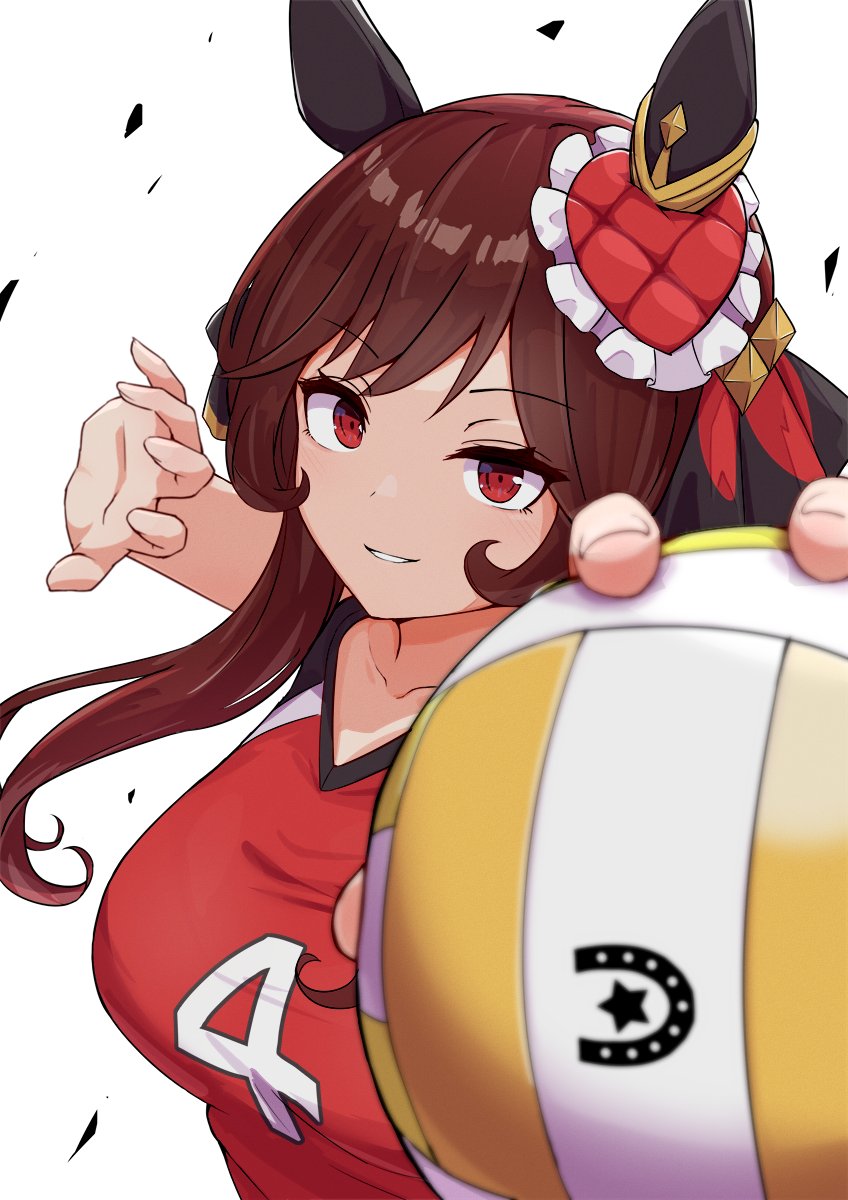 1girl alternate_costume animal_ears ball breasts brown_hair collarbone gentildonna_(umamusume) grin hair_between_eyes hair_ornament highres horse_girl impending_doom kk_tofu looking_at_viewer medium_breasts medium_hair pov red_eyes smile soccer_ball soccer_uniform solo sportswear umamusume white_background