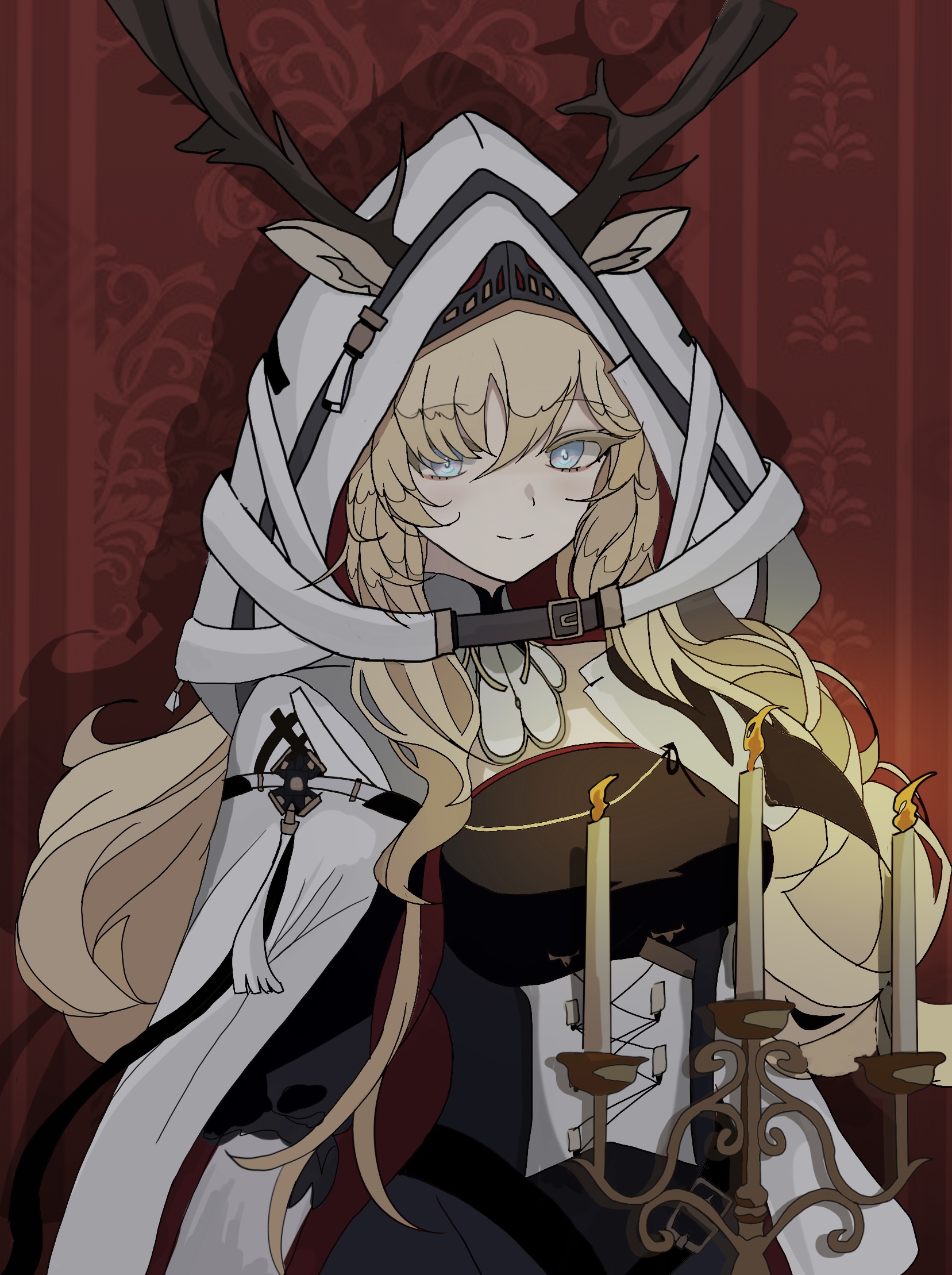 1girl animal_ears antlers horns_through_headwear horns_through_hood arknights blonde_hair blue_eyes blush bodystocking breasts candle candlestand cape cloak cowboy_shot deer_antlers deer_ears deer_girl dot_nose ears_through_headwear ears_through_hood fire hair_over_one_eye hat_on_horn highres holding holding_candle hood hood_up horns large_breasts light_smile long_hair looking_at_viewer open_cloak open_clothes shadow sidelocks solo vier122 viviana_(arknights) wallpaper_(object) white_cape white_cloak white_hood