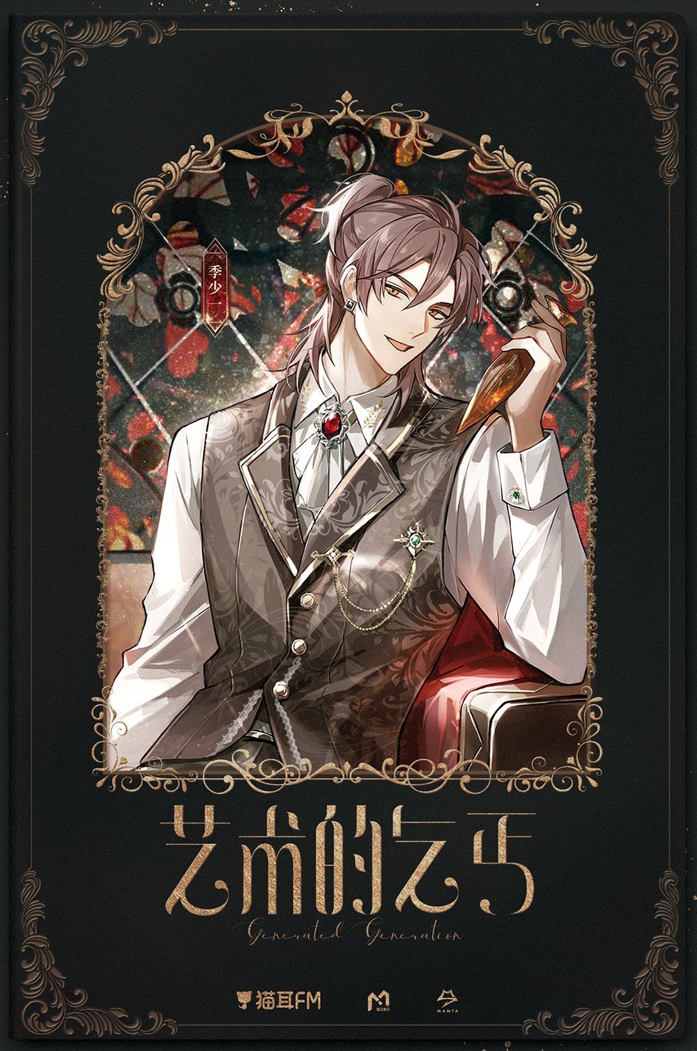1boy :d album_name ascot black_border border brooch brown_hair brown_vest buttoned_cuffs buttons chinese_commentary chinese_text collared_shirt couch dagger elbow_rest gem hair_between_eyes half_updo hand_up highres holding holding_dagger holding_knife holding_weapon jewelry ji_shaoji knife long_sleeves looking_at_viewer male_focus manta_(maoer_entertainment) medium_hair official_art open_mouth picture_frame red_gem reverse_grip shirt silver_trim sitting smile solo upper_body v-shaped_eyebrows vest weapon white_ascot white_shirt yellow_eyes