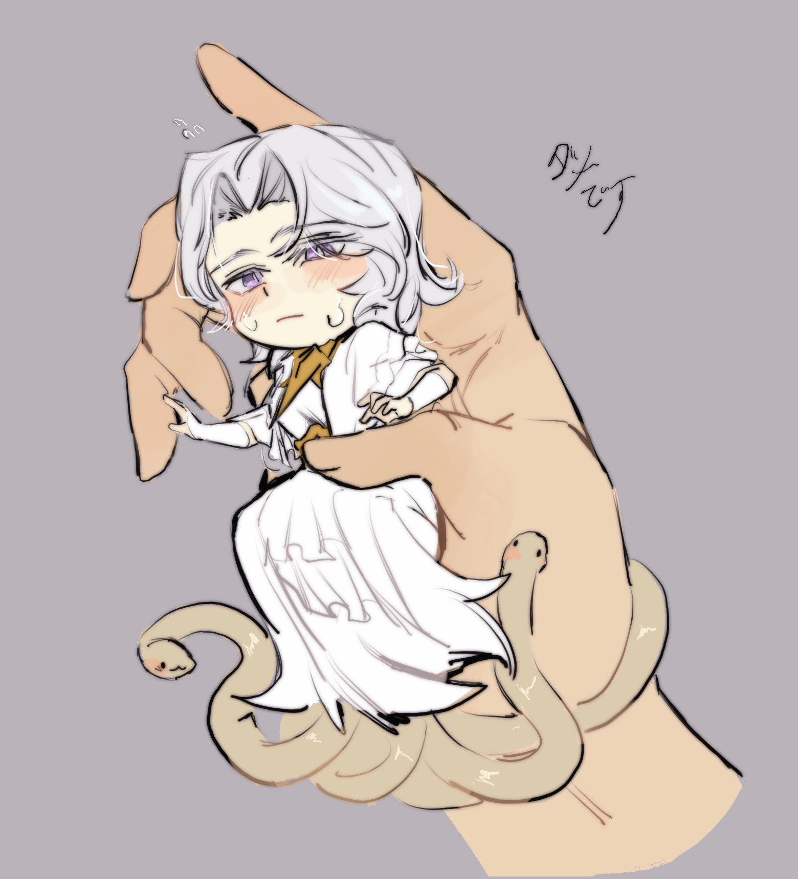 1boy 1other animal blush dark_souls_(series) dark_souls_i dark_sun_gwyndolin dress grey_hair highres holding holding_mini_person long_sleeves male_focus mini_person miniboy pink_eyes short_hair short_sleeves simple_background snake solo_focus sweat white_dress zunkome