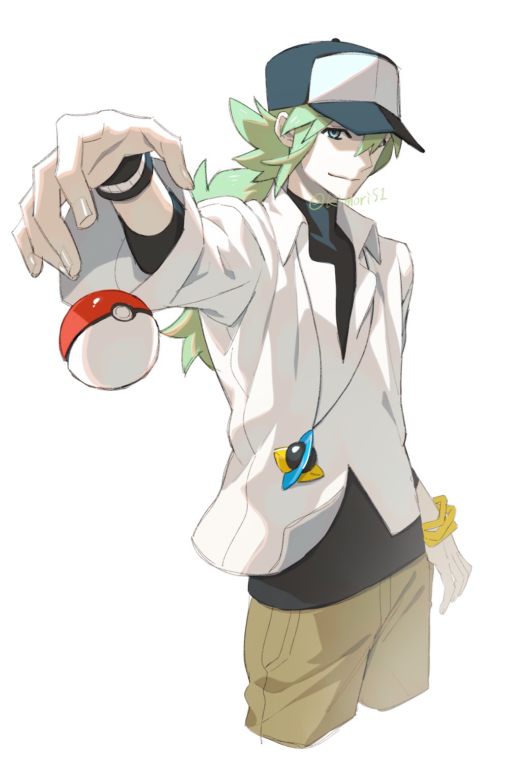 1boy artist_name baseball_cap black_hat blue_eyes bracelet brown_pants closed_mouth commentary_request cropped_legs green_hair hat highres jewelry long_hair male_focus multiple_bracelets n_(pokemon) nagiru necklace nintendo pants poke_ball poke_ball_(basic) pokemon pokemon_black_and_white shirt simple_background solo standing twitter_username two-tone_headwear white_background white_hat white_shirt
