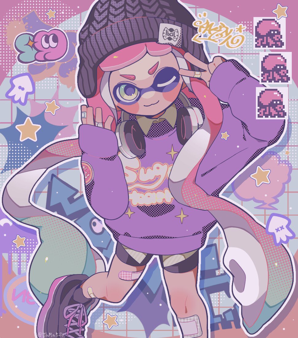 1girl :3 bandaid bandaid_on_leg beanie bike_shorts black_hat black_shoes black_shorts border closed_mouth commentary cross-laced_footwear gradient_hair green_eyes green_hair grid_background hat headphones headphones_around_neck inkling inkling_girl inkling_player_character long_hair long_sleeves looking_at_viewer multicolored_background multicolored_hair nintendo one_eye_closed outside_border pink_hair pink_sweater print_sweater round_border shoes shorts sleeves_past_wrists smile solo sparkle splatoon_(series) splatoon_3 star_(symbol) sweater untranslatable_commentary tama5sp tentacle_hair thick_eyebrows two-tone_hair v very_long_hair