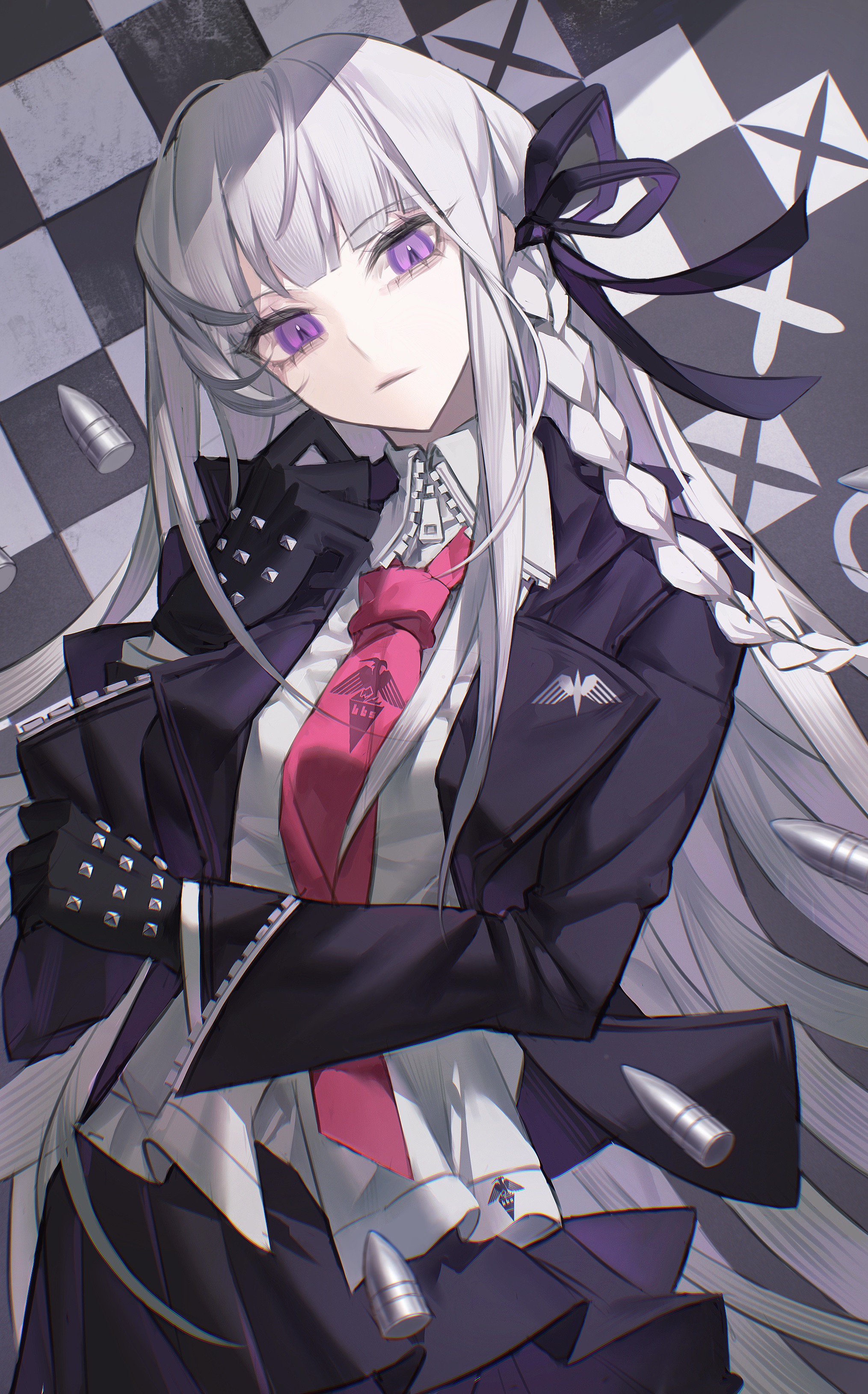 1girl absurdres arm_across_waist black_gloves blunt_bangs braid bullet checkered_background chinese_commentary commentary_request cowboy_shot danganronpa:_trigger_happy_havoc danganronpa_(series) expressionless gloves hair_ribbon hand_up highres jacket kirigiri_kyoko long_hair long_sleeves looking_at_viewer necktie open_clothes open_jacket pink_necktie procreate_(medium) purple_eyes purple_jacket purple_skirt ribbon shirt side_braid single_braid skirt solo standing straight_hair studded_gloves white_hair white_shirt yi_zhen_gui_mu zipper sleeve_zipper