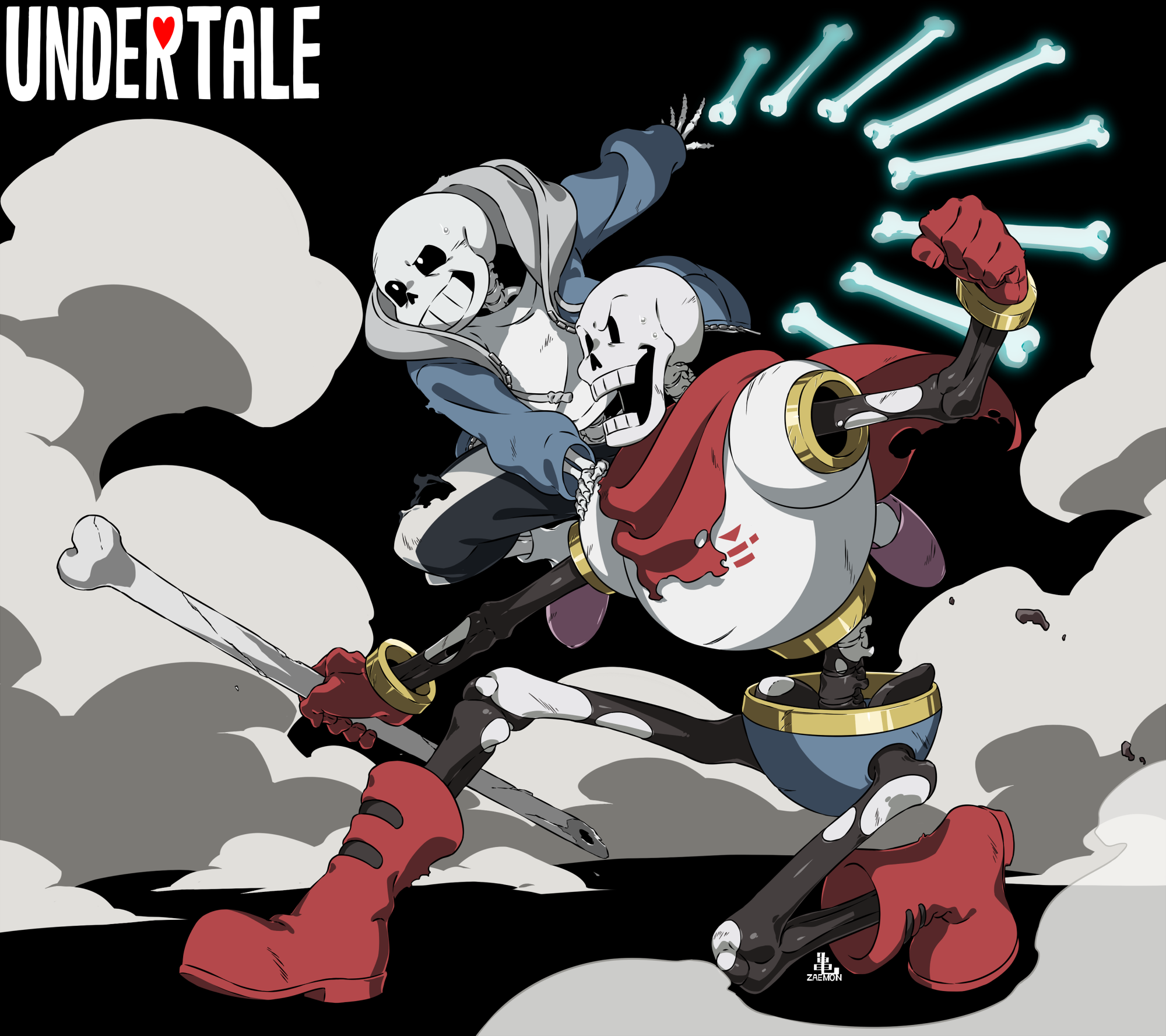 2boys ankle_boots black_background black_sclera blue_jacket bone boots brothers cape cel_shading clenched_hand colored_sclera commentary copyright_name drawstring dust_cloud fighting_stance floating floating_object from_side full_body gloves grin hand_on_another's_shoulder highres holding holding_bone hood hood_down hooded_jacket jacket jumping kamezaemon looking_ahead male_focus midair multiple_boys on_one_knee open_clothes open_jacket open_mouth outstretched_arm papyrus_(undertale) pink_boots red_cape red_footwear red_gloves sans_(undertale) scratches shirt shorts siblings simple_background skeleton slippers smile socks sweat torn_cape torn_clothes torn_shorts undertale utdr_(toby_fox) white_shirt white_socks